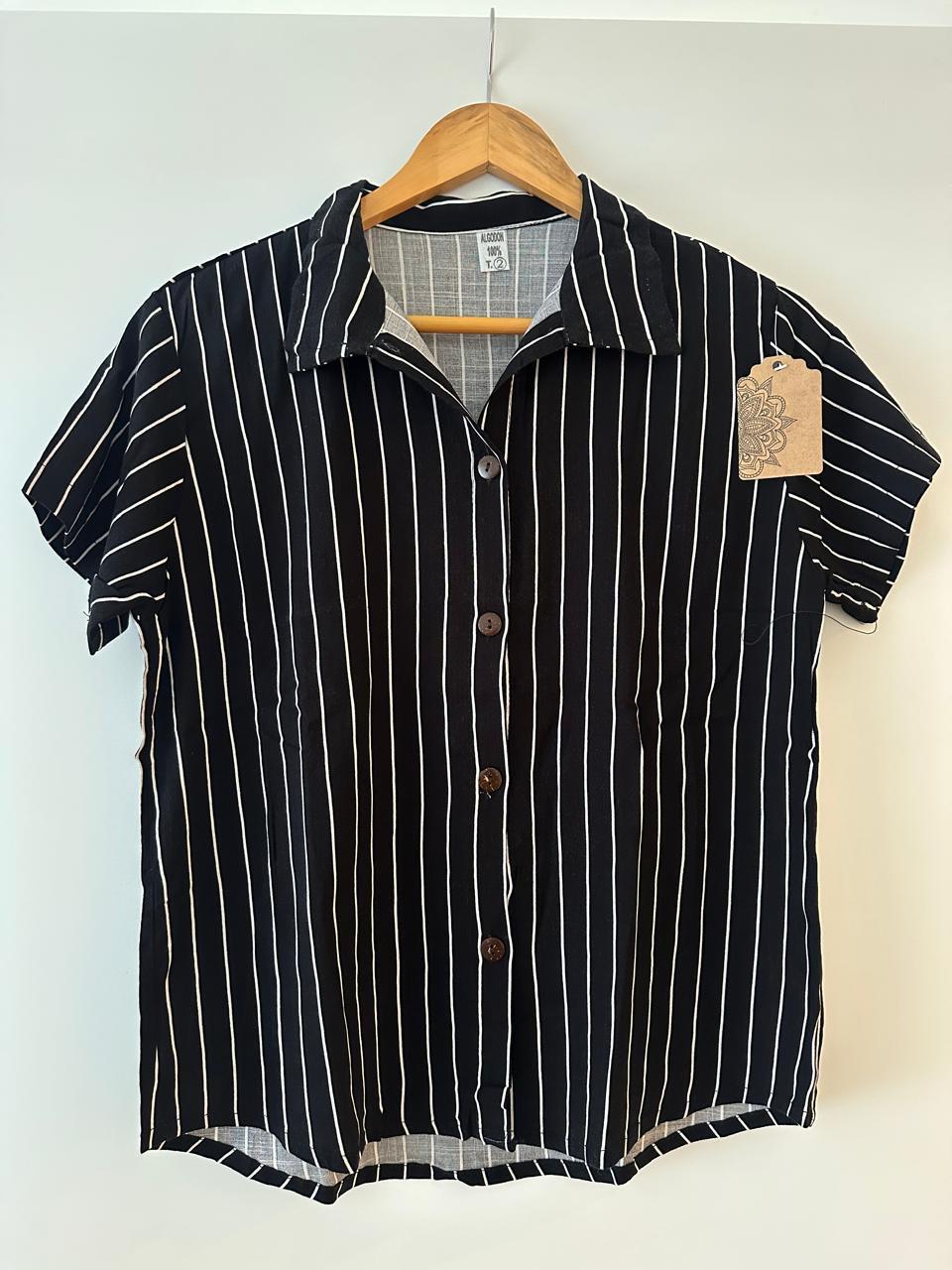 Camisa confeccionada en lino con elasticidad que aporta frescura y un calce cómodo. Las rayas finas y los botones frontales le dan un aire clásico y relajado, ideal para looks de todos los días.