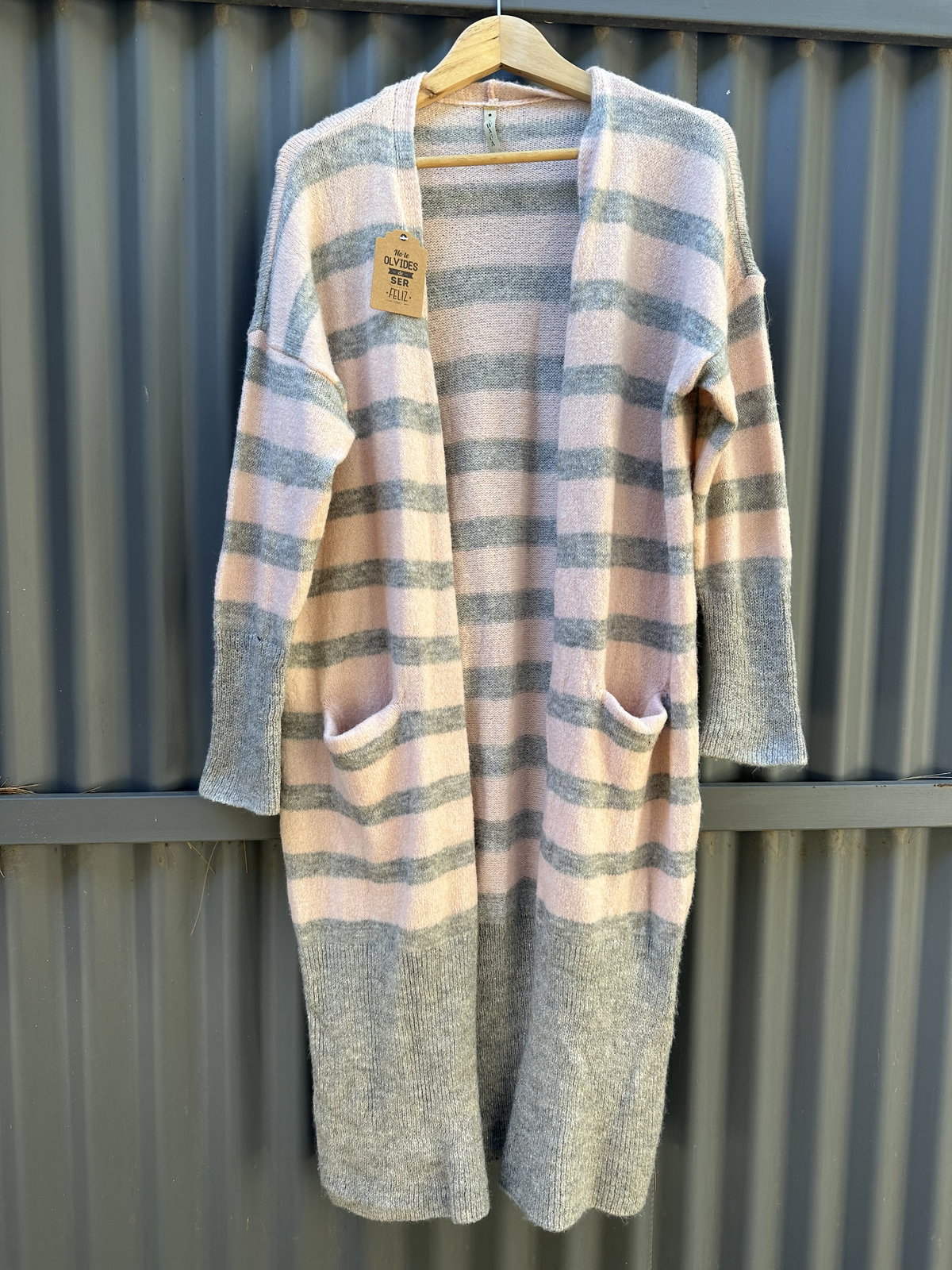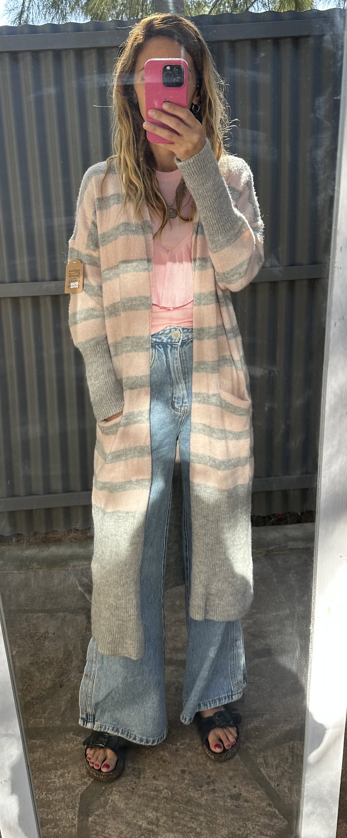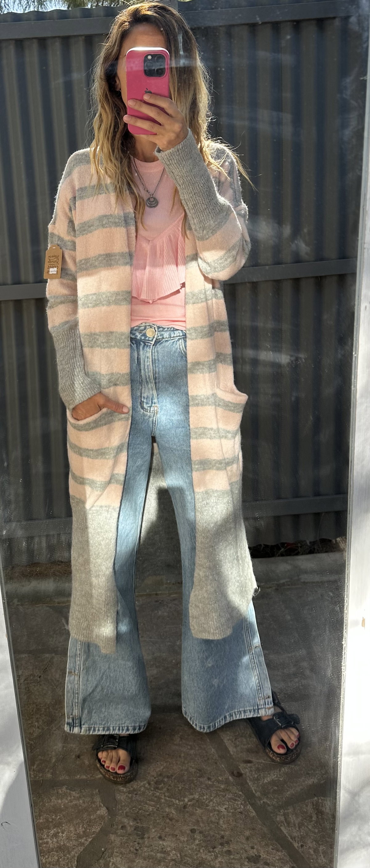 Suave, mullido y de esos que abrigan de verdad. Este cardigan largo tejido en lana frizz tiene una textura increíblemente suave que da una sensación súper cómoda al usarlo. Las rayas en tonos suaves le aportan un aire relajado y moderno, perfecto para sumar estilo en los días frescos.
