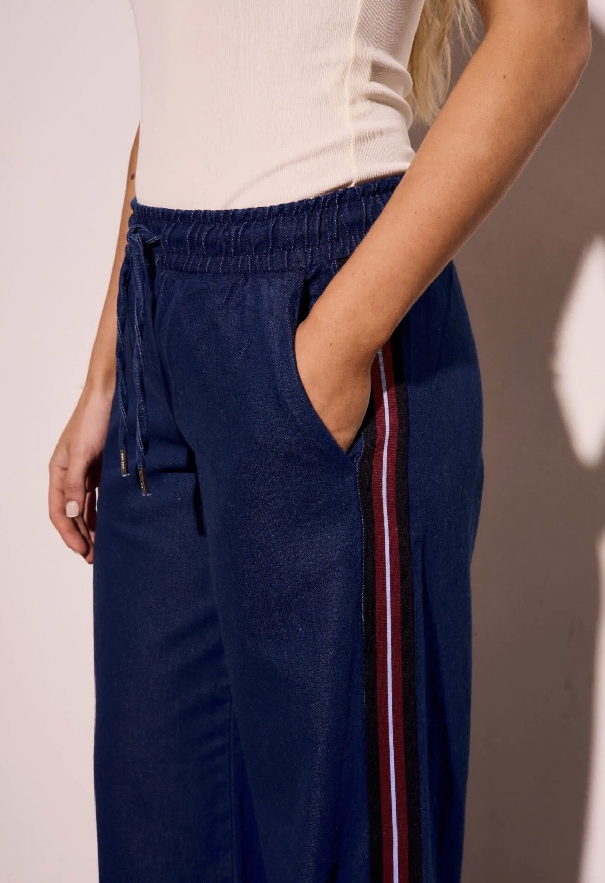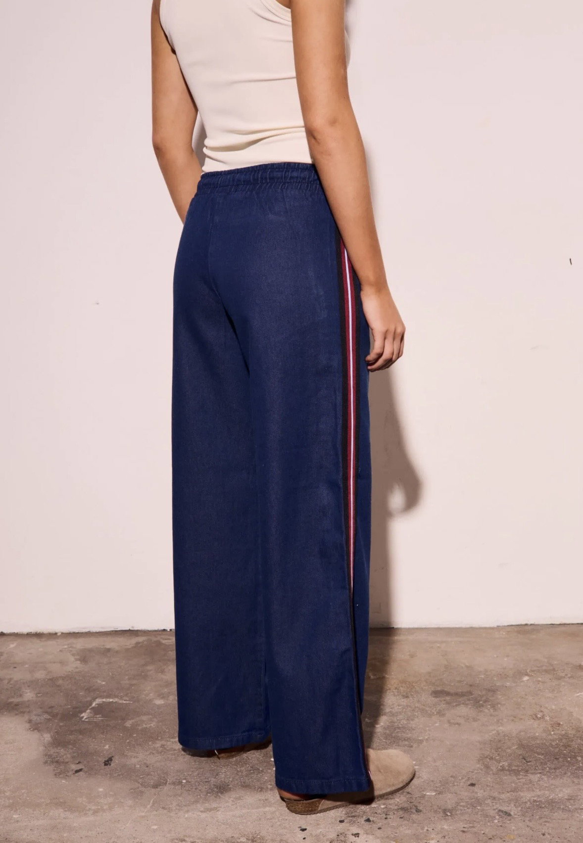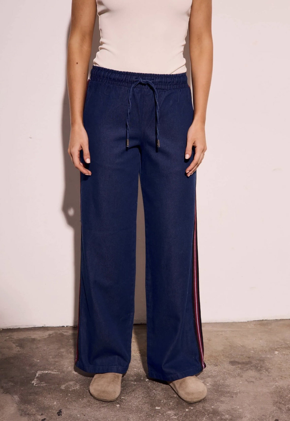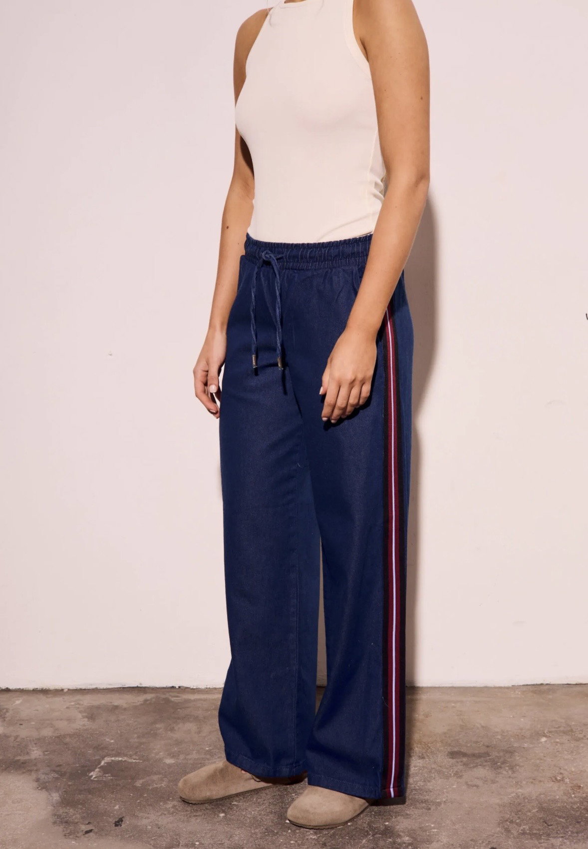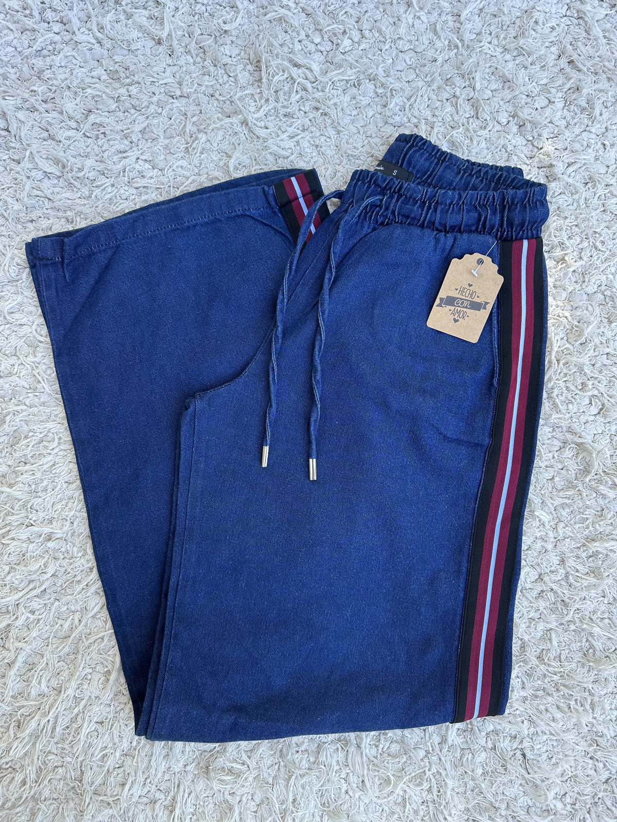 La mezcla perfecta entre comodidad y estilo 💫 Este jean tiene cintura elástica con lazo regulable que se adapta súper bien al cuerpo y una silueta wide leg que estiliza y alarga la pierna. Las franjas laterales le dan ese toque deportivo que lo vuelve distinto a cualquier jean clásico.