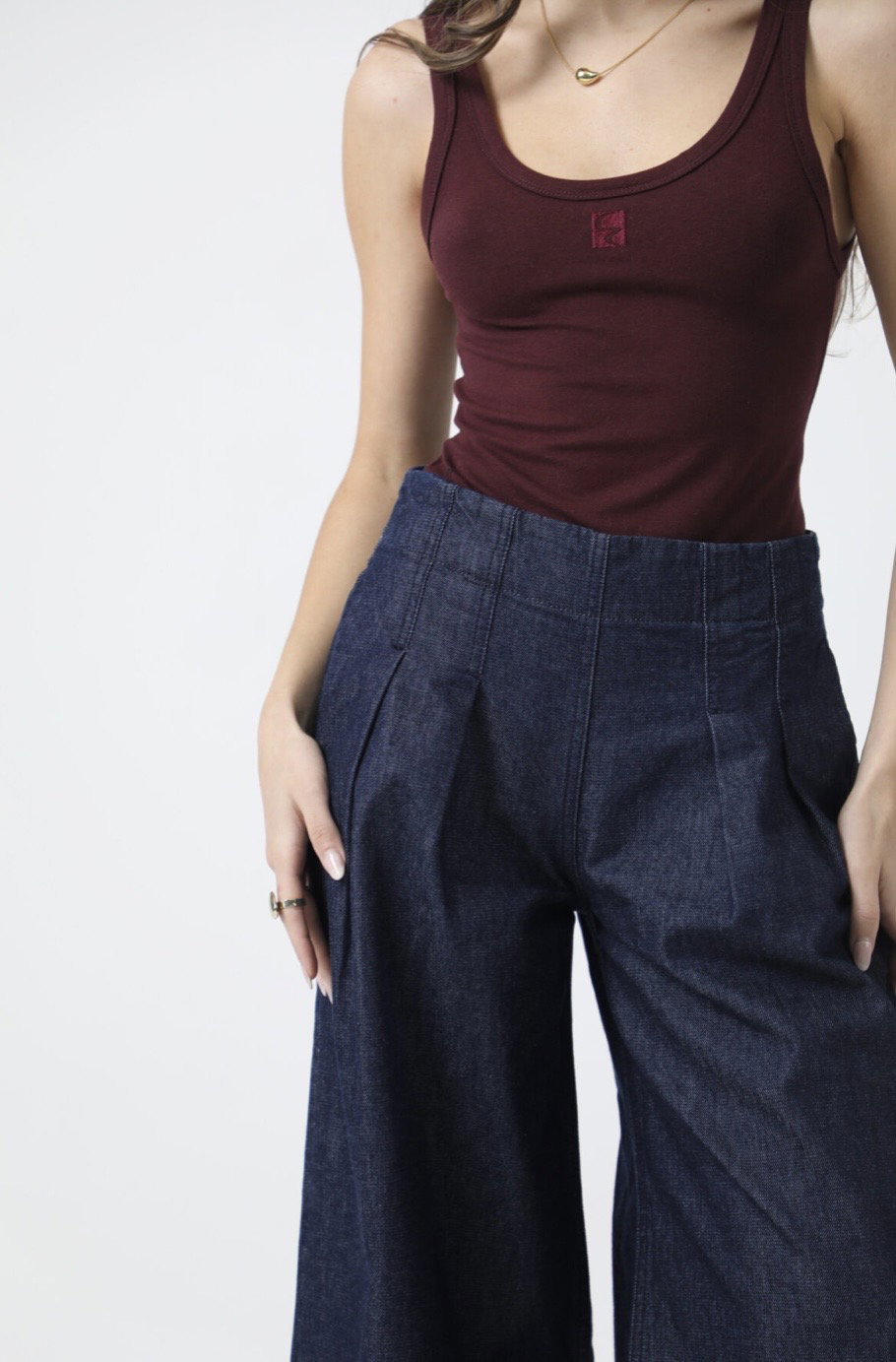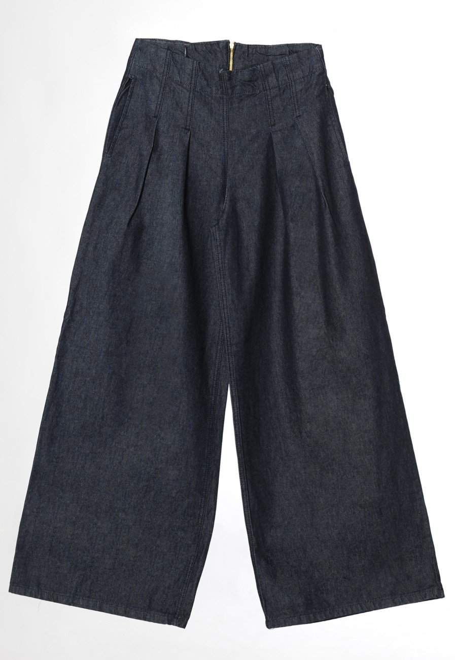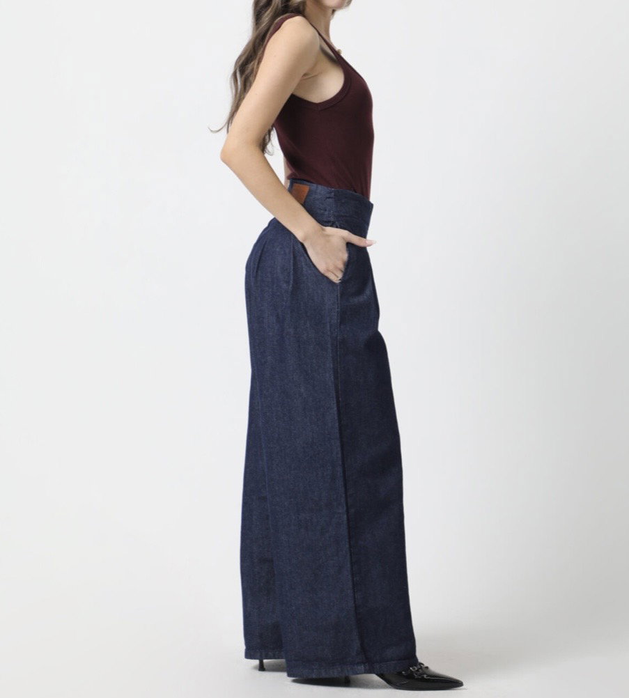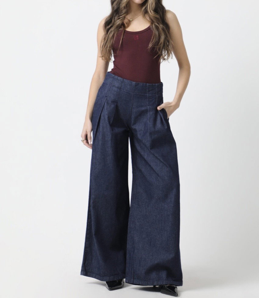 Tiro alto, cintura marcada y piernas ultra amplias que generan un movimiento increíble al caminar. Un diseño que mezcla lo sastrero con el denim para lograr un look moderno, fuerte y lleno de presencia.