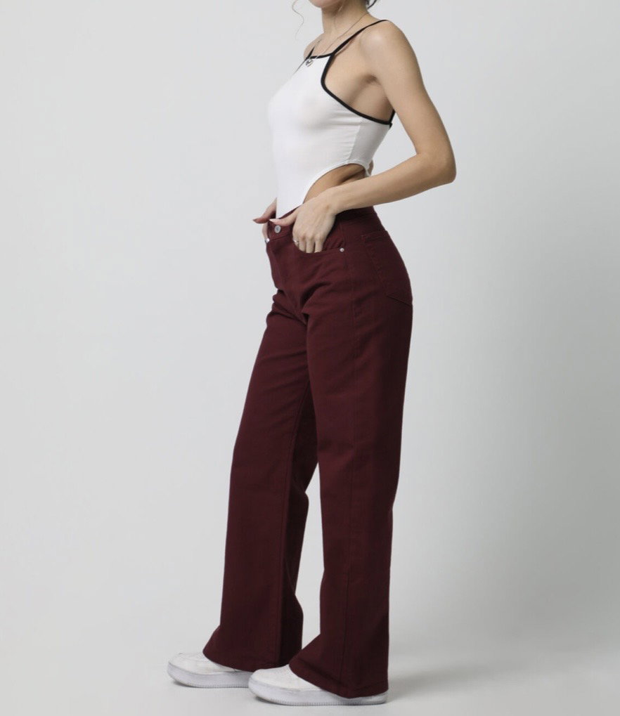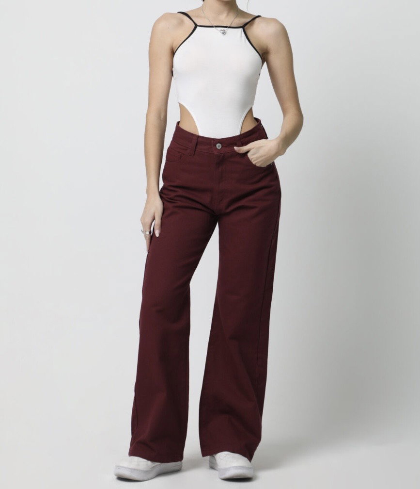 Este jean wide leg en tono borravino es de esos que cambian todo el look.