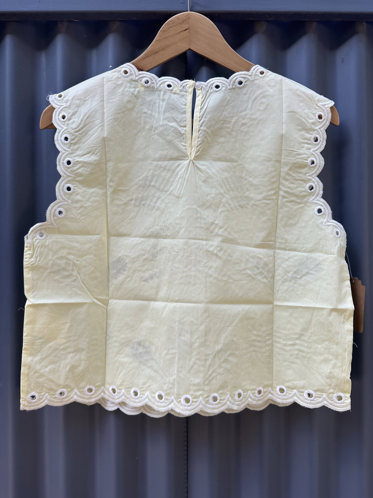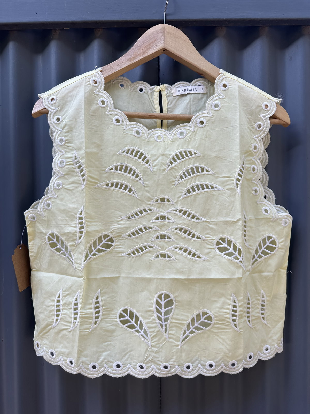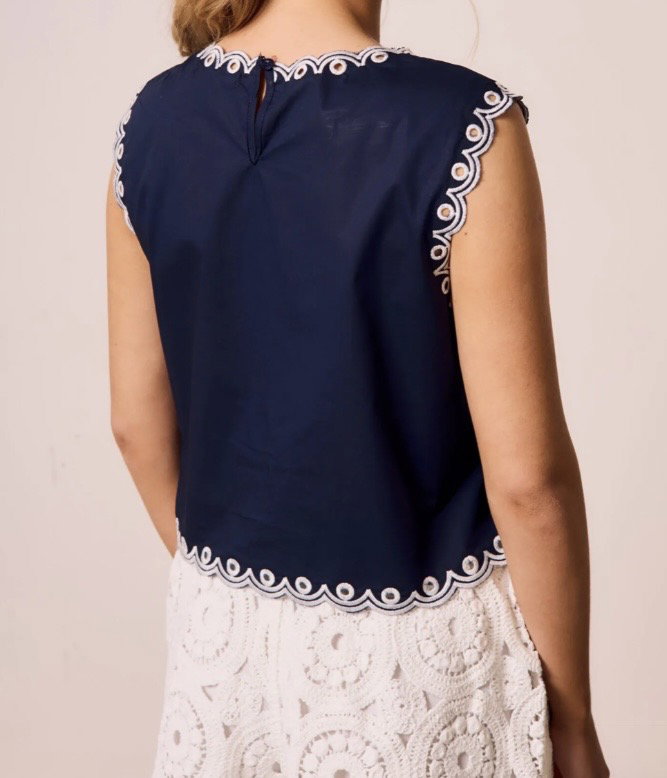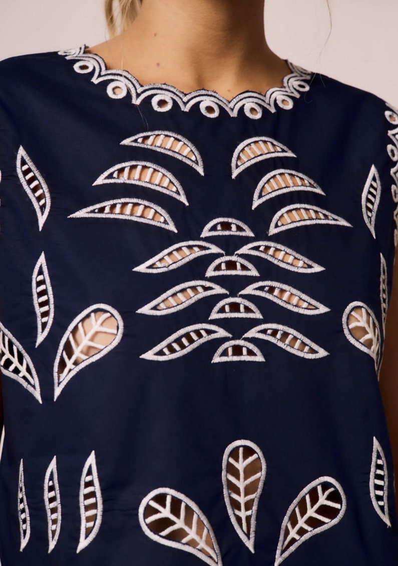 Una prenda que habla por sí sola. Musculosa con bordado calado que recorre el frente y las terminaciones, creando un diseño delicado que resalta sobre la tela.