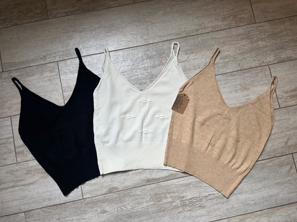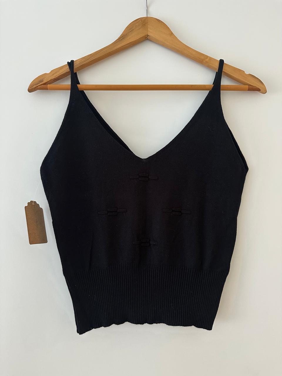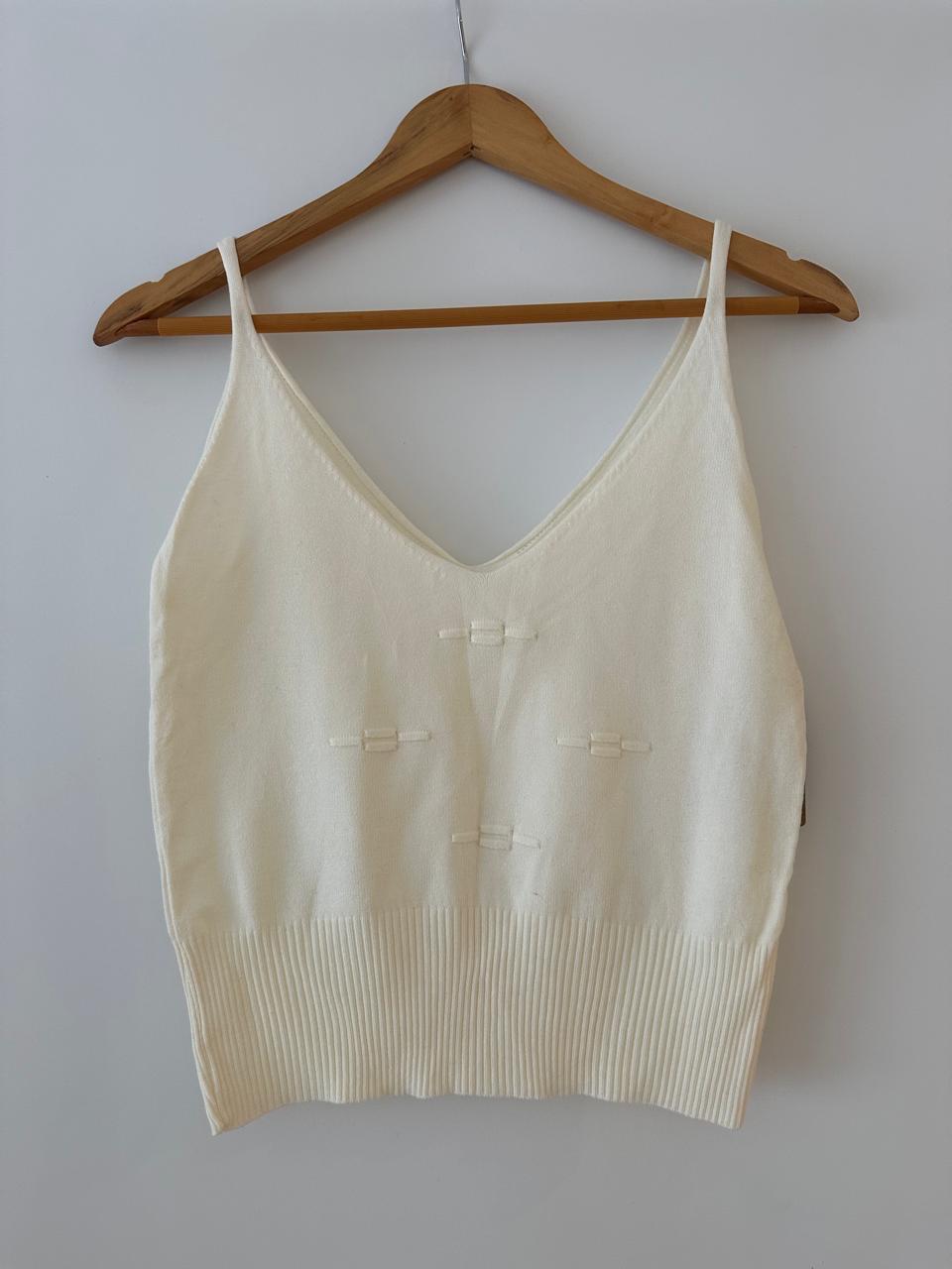 Musculosa tejida en hilo con lycra, liviana y suave al tacto. El tejido con pequeño labrado en el frente le suma un detalle sutil que la vuelve distinta sin perder su estilo simple.