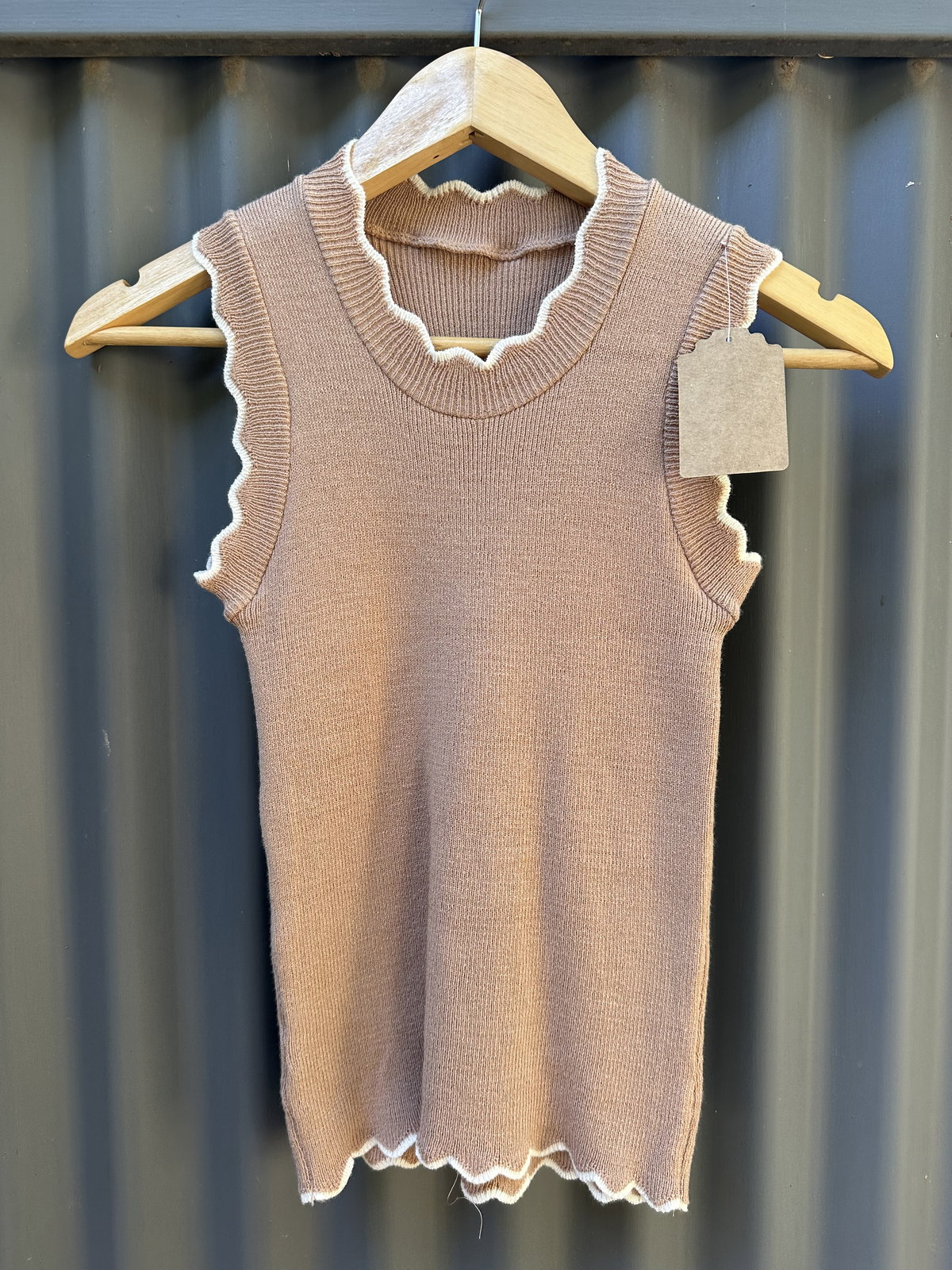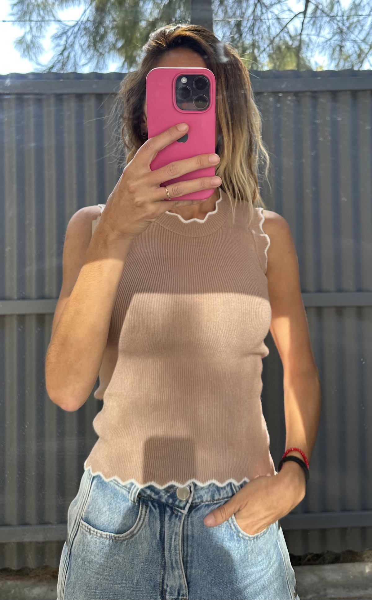Un básico delicado con un toque especial. Esta musculosa tejida en hilo con lycra tiene un tejido liso que se adapta cómodamente al cuerpo. Las terminaciones onduladas en cuello, mangas y cintura le aportan un detalle femenino y sutil que la hace distinta a cualquier básica.
