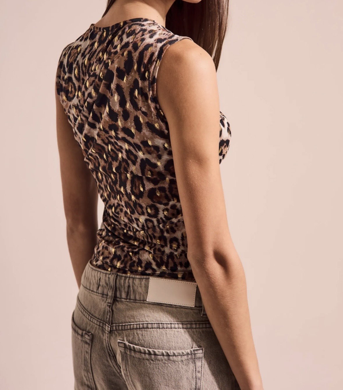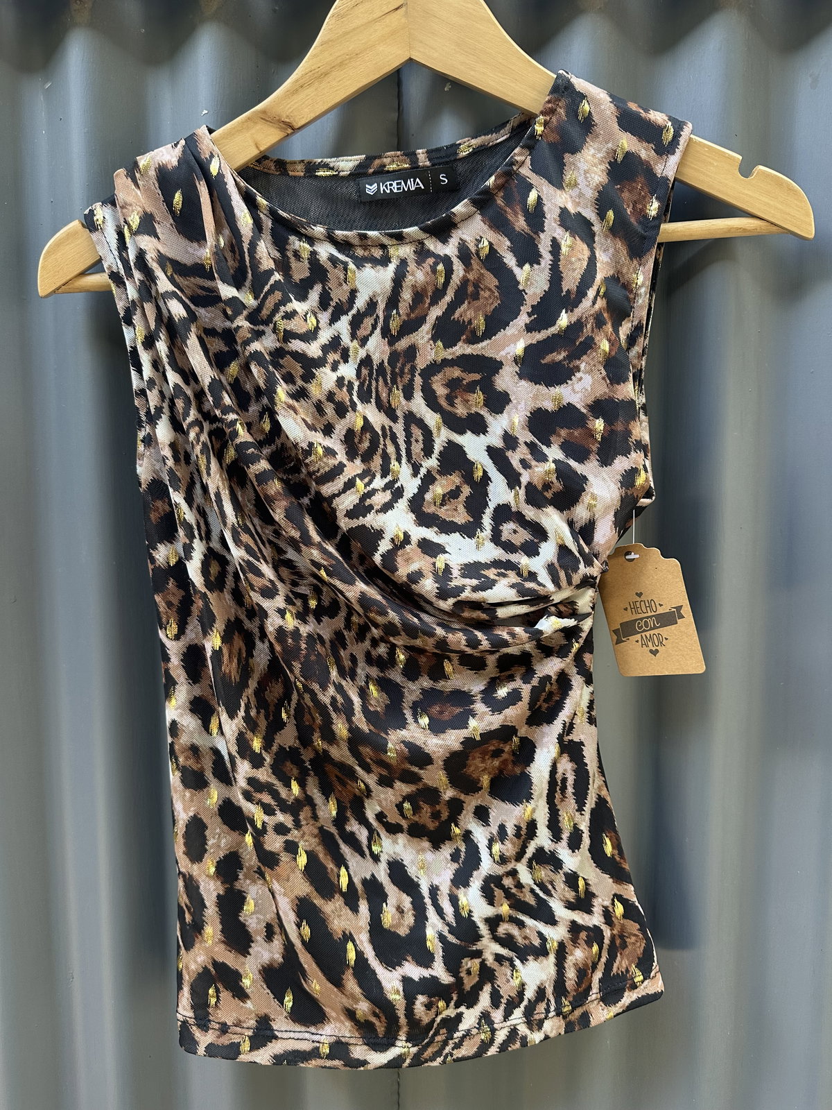 Una prenda que no pasa desapercibida. Musculosa de microtul forrado con estampa animal print y frunces laterales que estilizan y realzan la silueta. Liviana, cómoda y con el equilibrio perfecto entre actitud y feminidad.