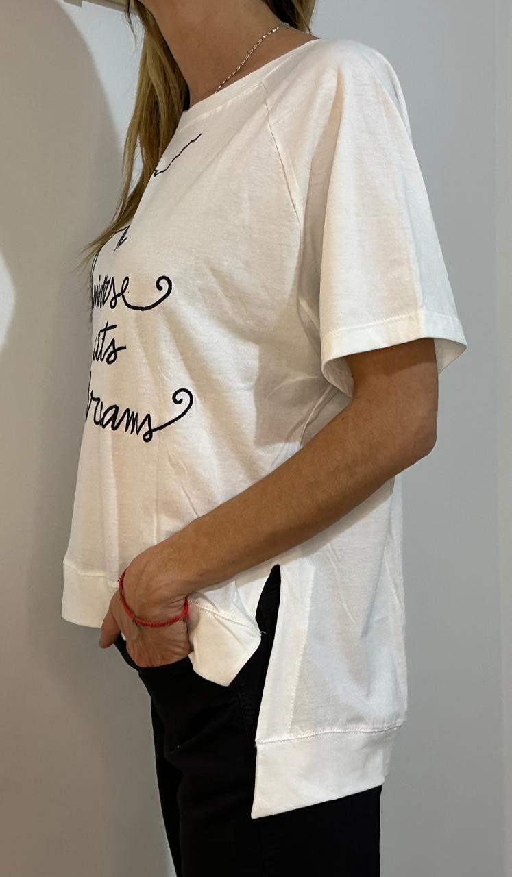 Remera de algodón estilo relaxed, con tajos laterales y frase bordada en el frente. Cómoda, amplia y con toda la onda urbana.