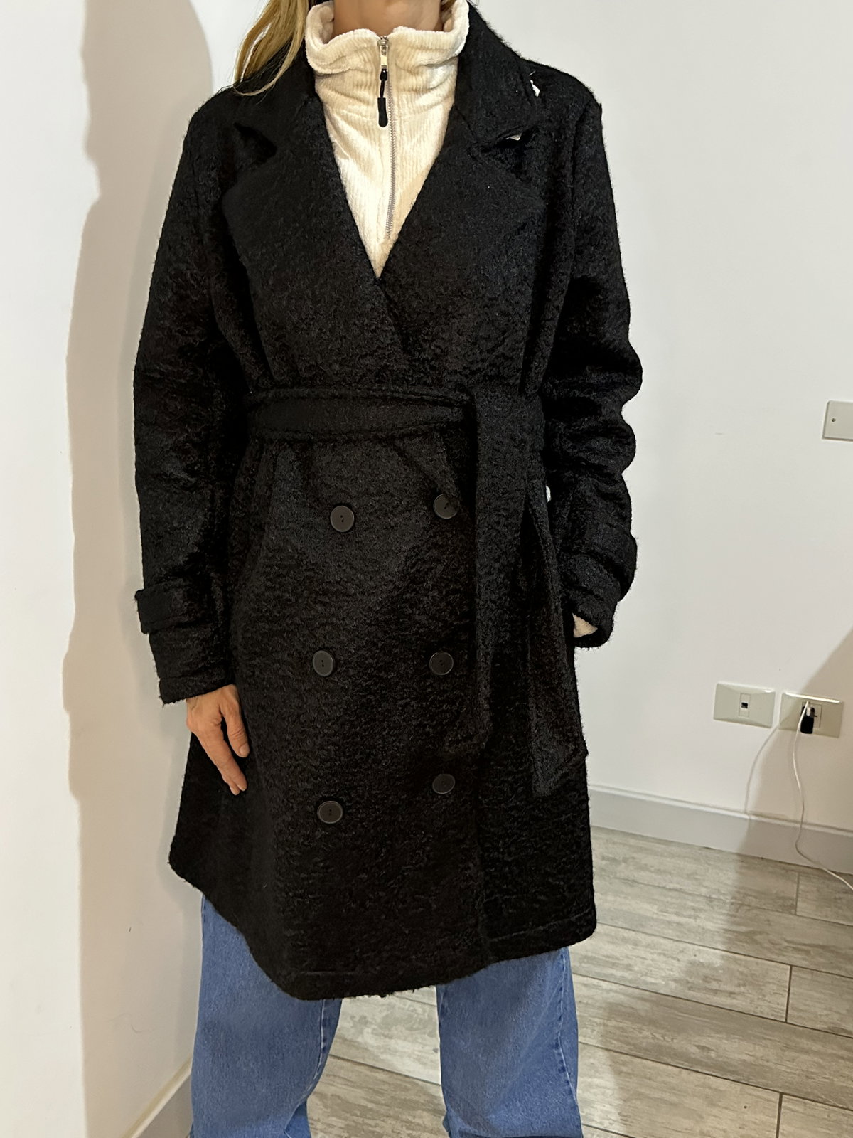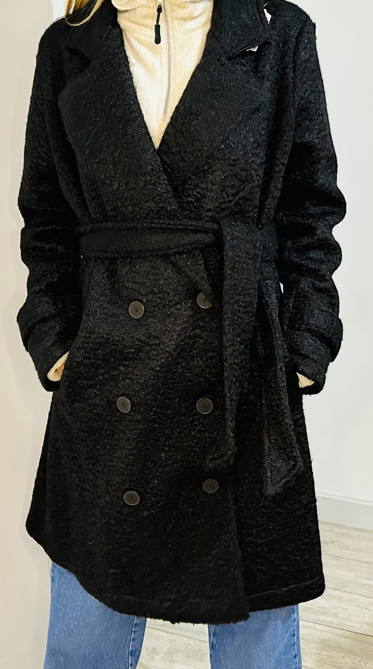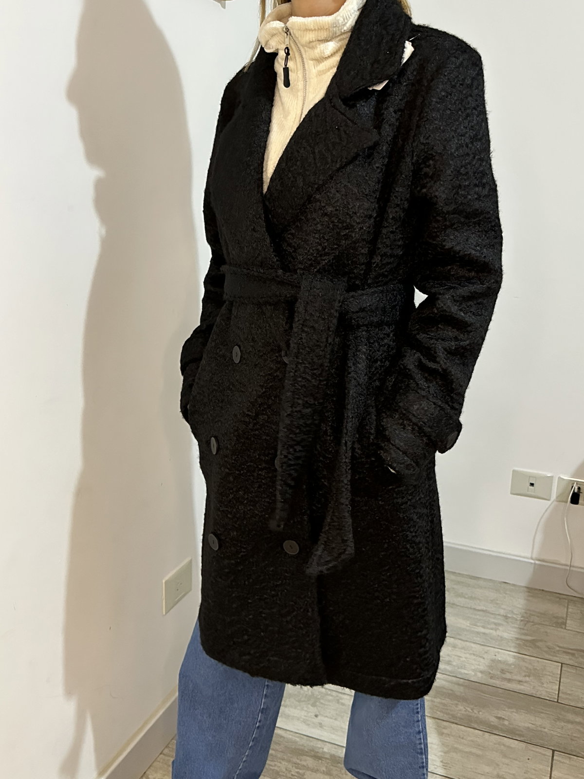 Tapado negro de paño tipo bouclé con cinturón súper largo, calentito pero mega elegante, híper versátil