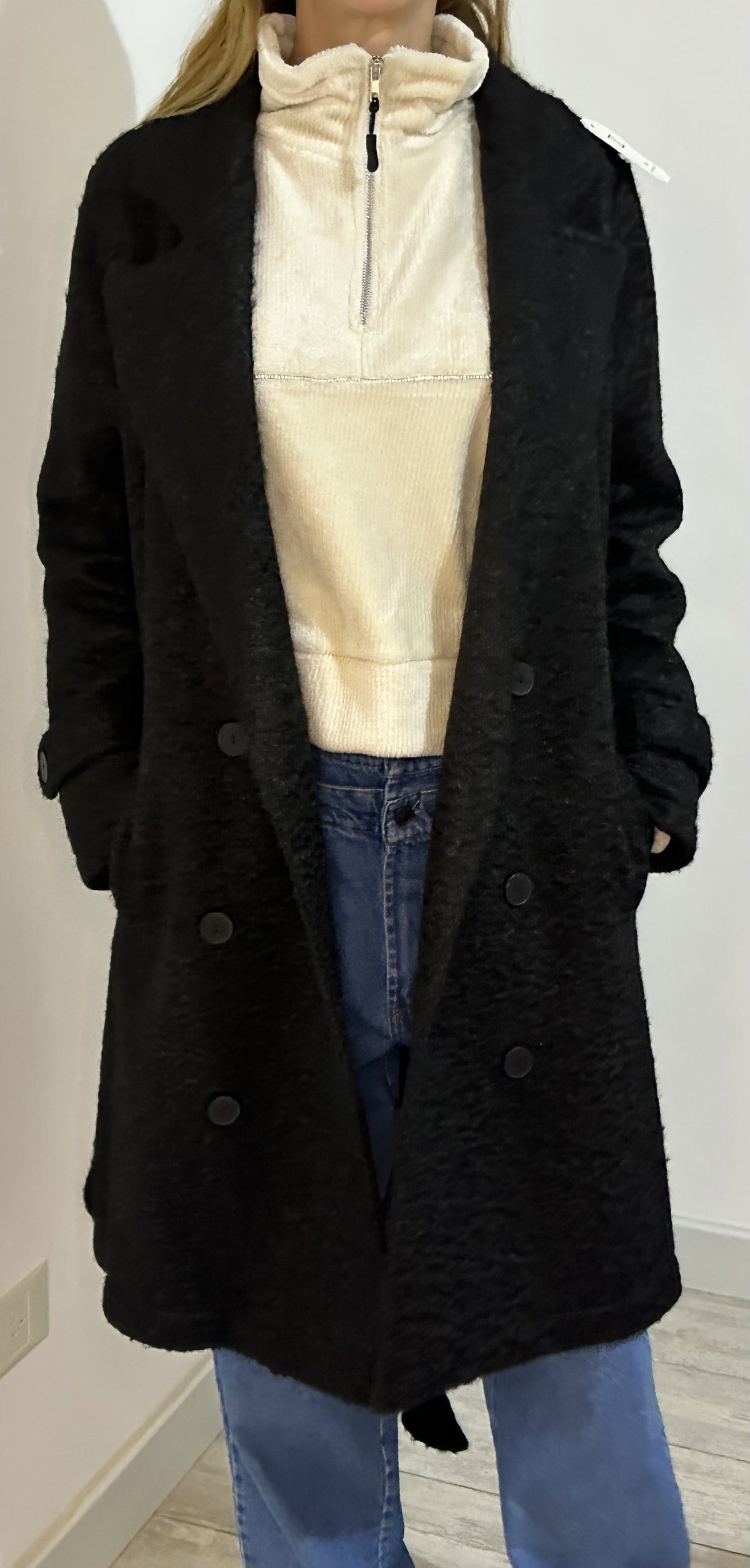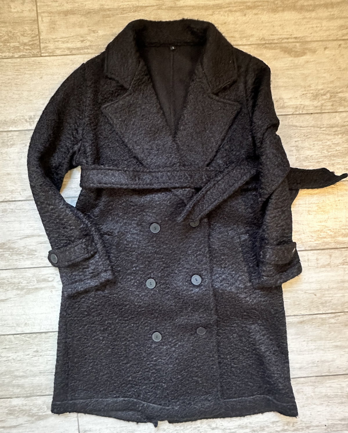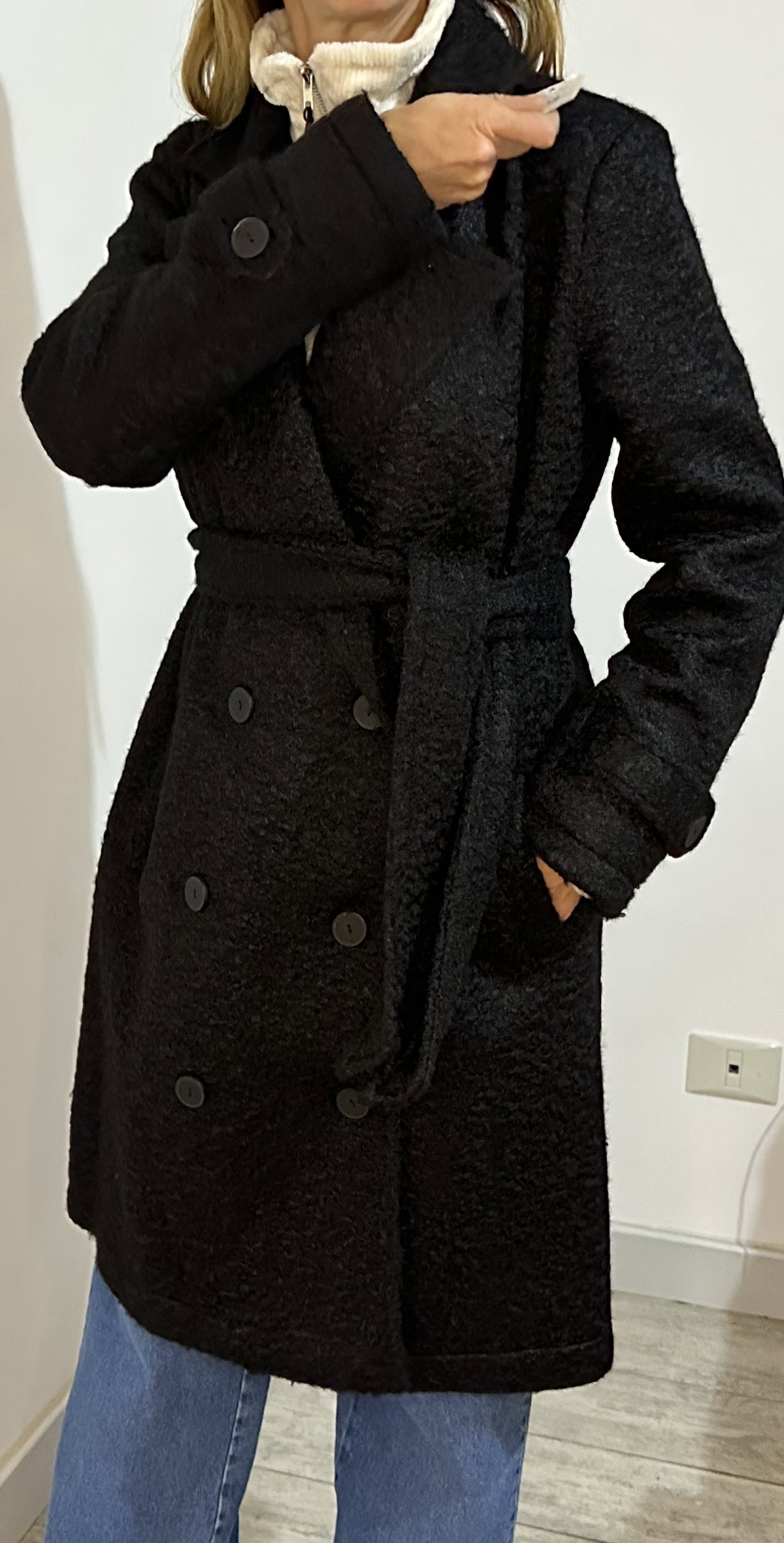 Tapado negro de paño tipo bouclé con cinturón súper largo, calentito pero mega elegante, híper versátil