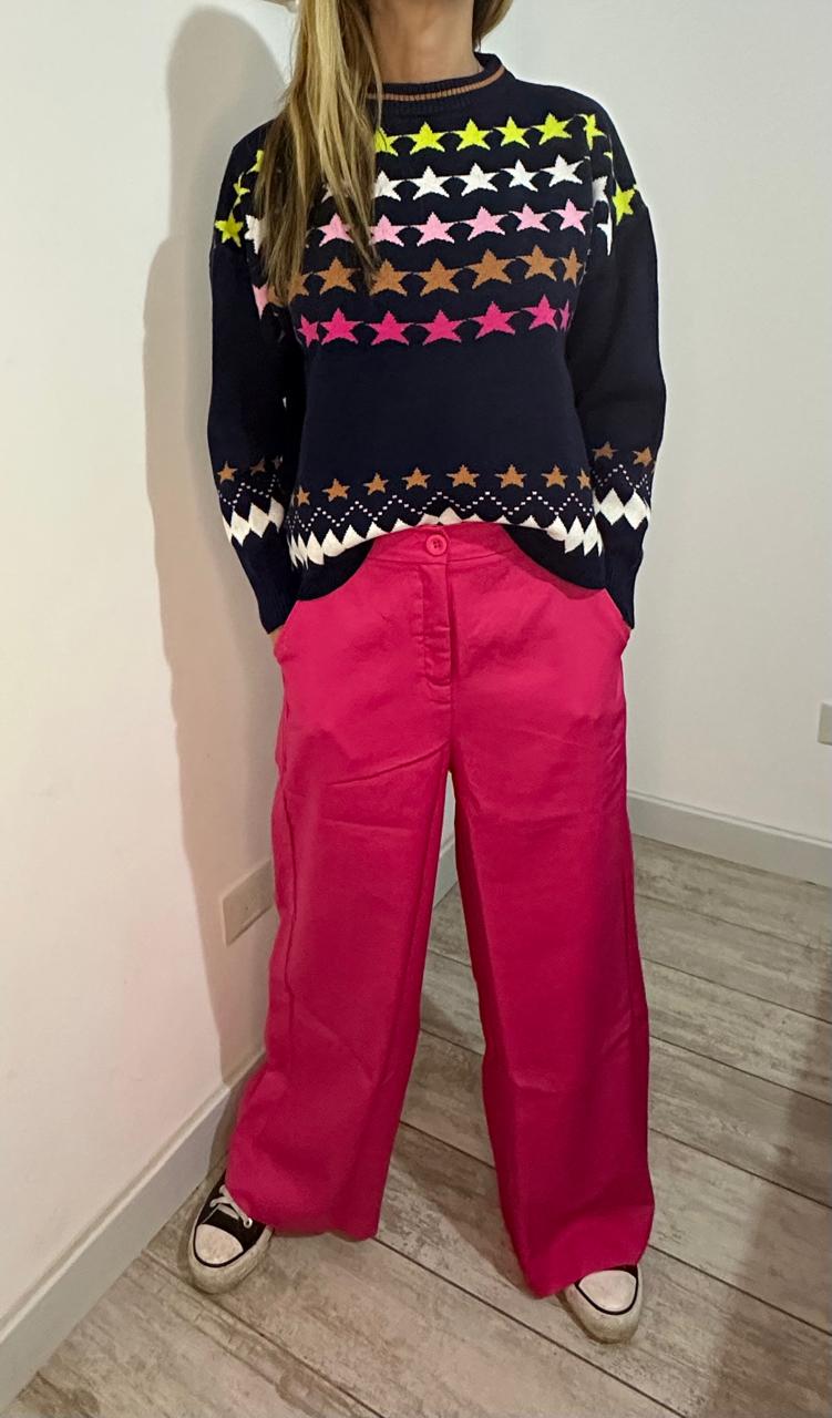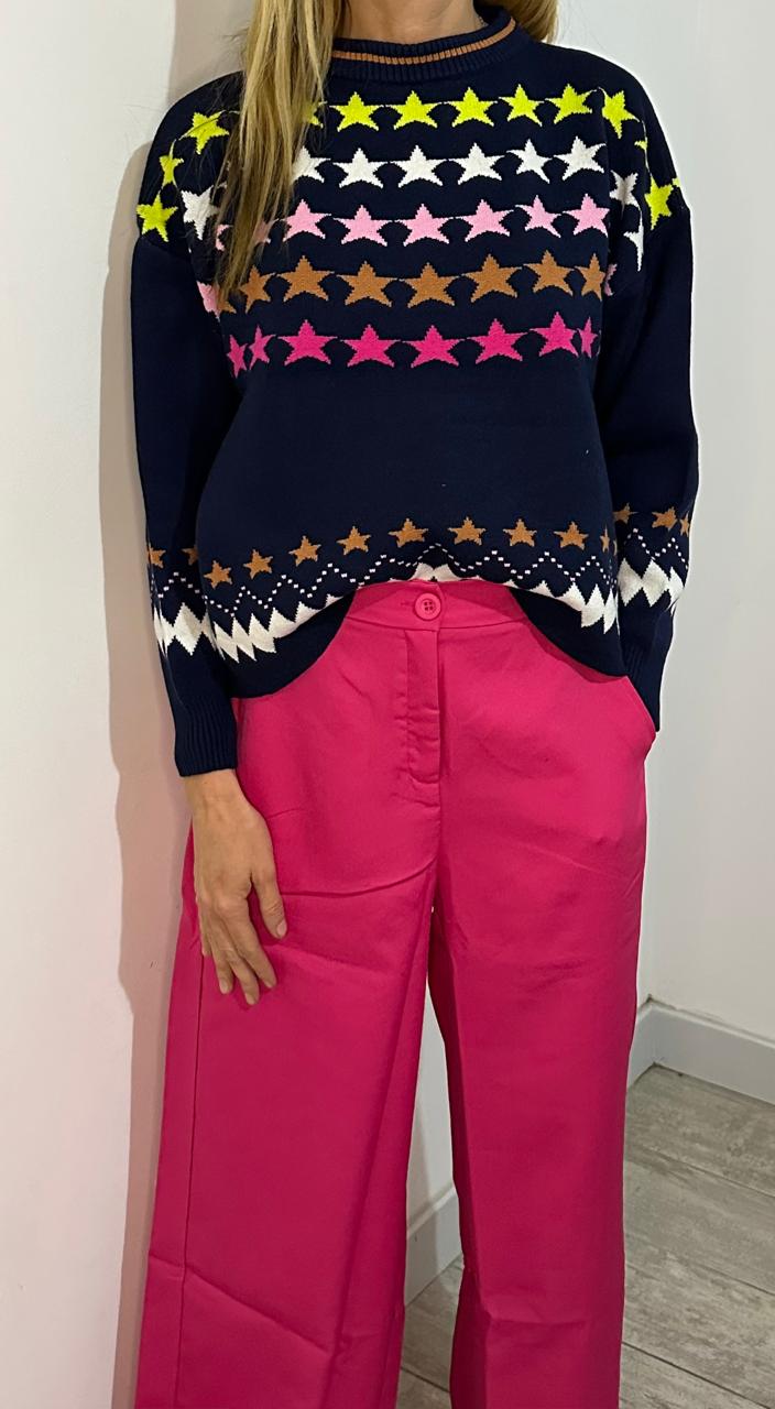 Sweater tejido en bremer con lycra, súper abrigado, con caída firme y estructura. Estampa full al frente y en la espalda, de estrellas con tonos flúo.