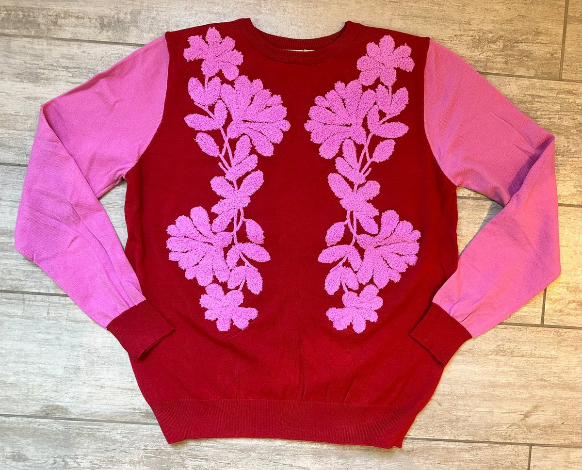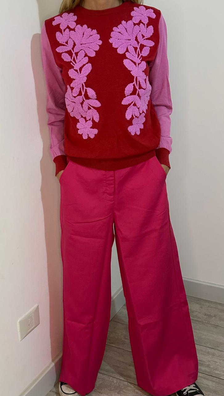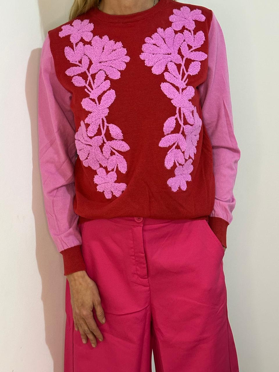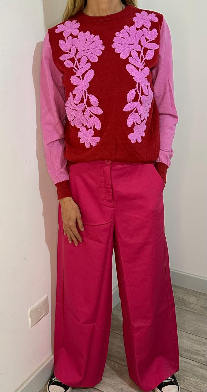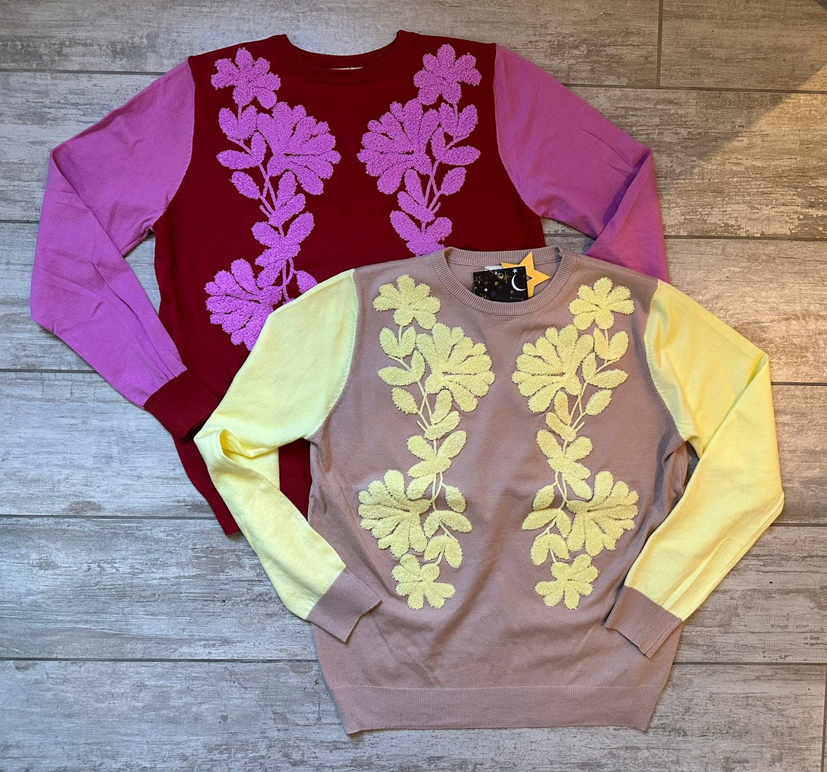 Sweater tejido en bremer con lycra, suave y con excelente calce. Tiene diseño bicolor con mangas contrastantes y bordado floral en relieve en el frente, que le da textura y mucha personalidad.