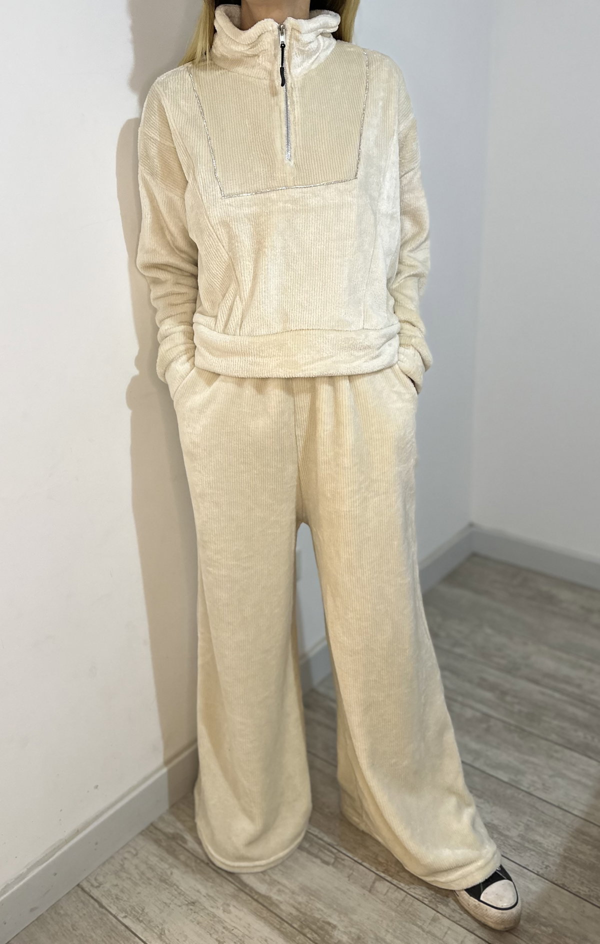 Confort elevado a otro nivel. Este conjunto en corderoy ultra suave incluye buzo con cierre hasta el pecho, cuello alto y un detalle sutil pero encantador: un brillo delicado en el frente que le da un toque único. El pantalón, de corte amplio y cintura elástica, acompaña con caída fluida y total comodidad.