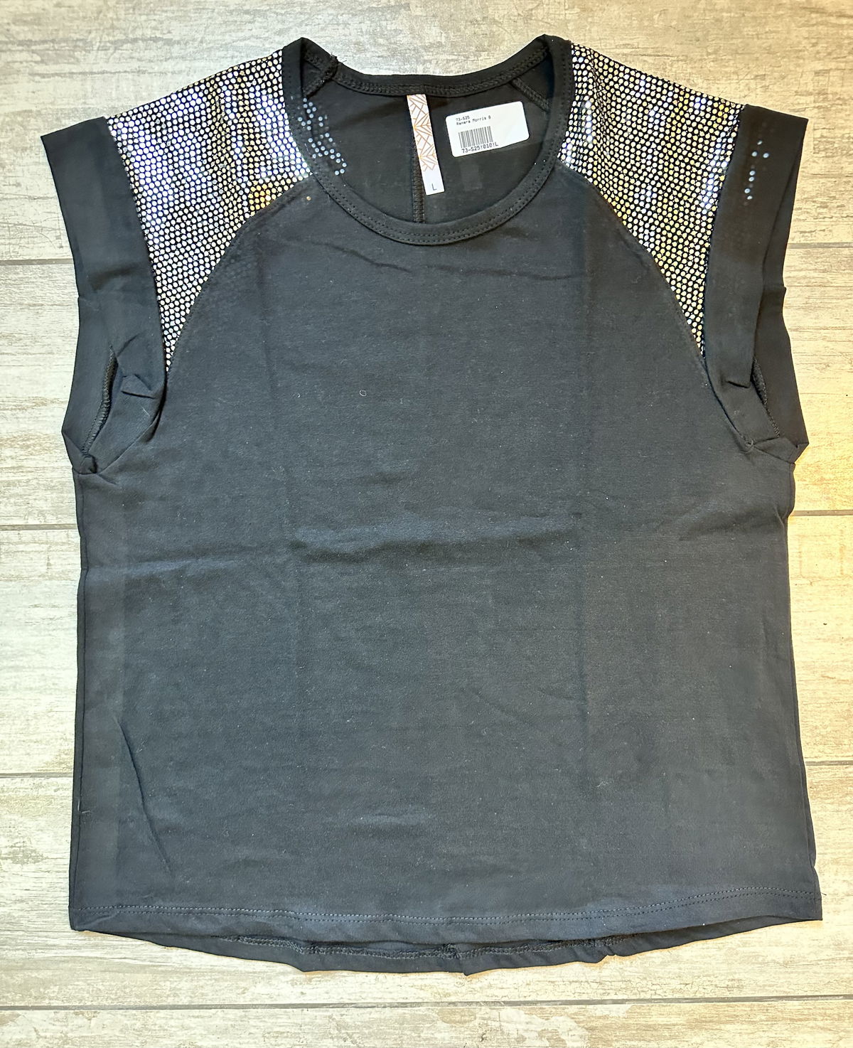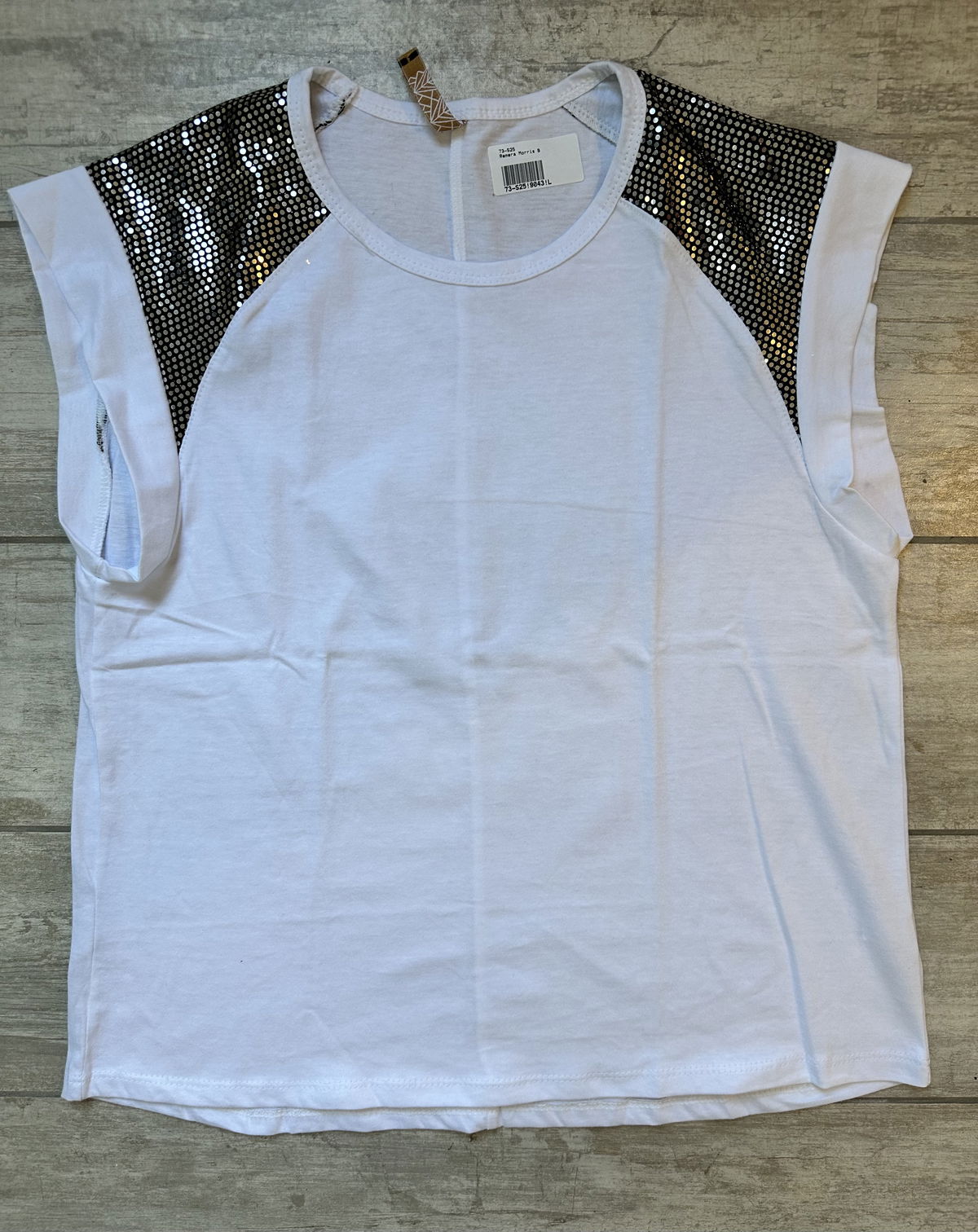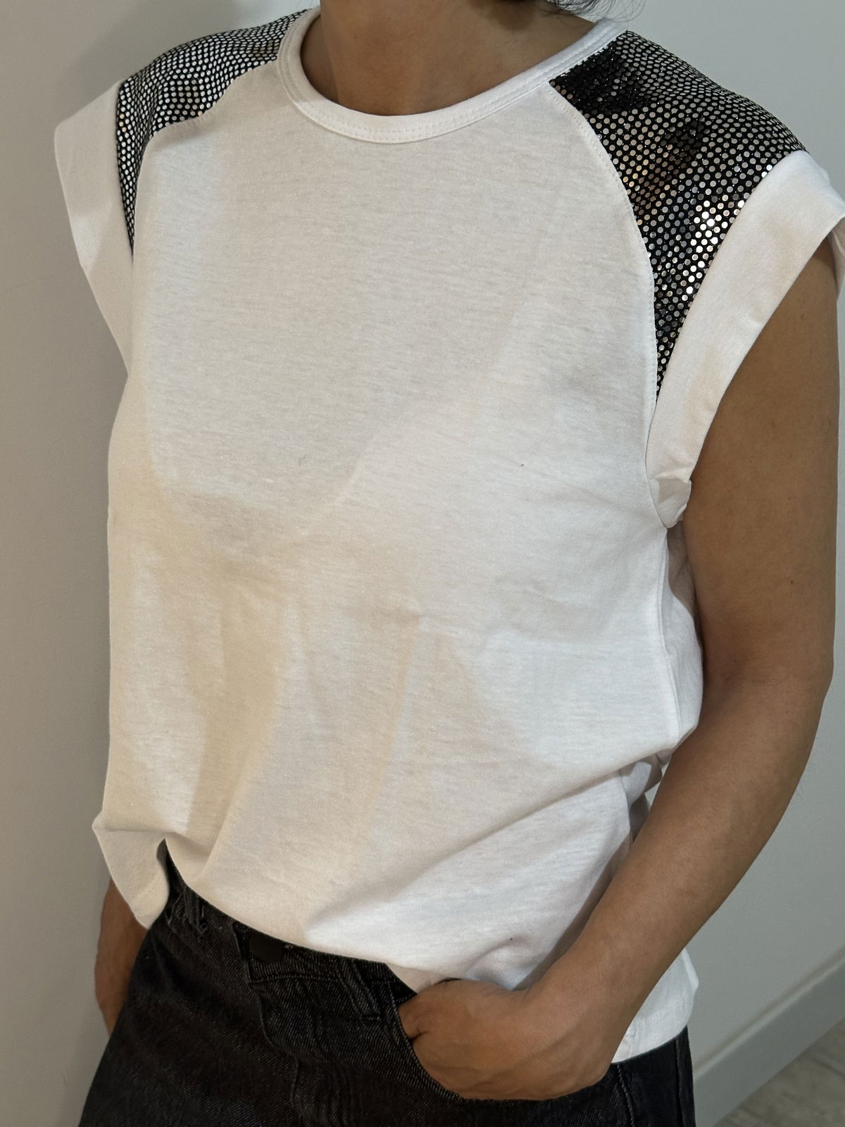 Clásica con actitud. Esta remera de algodón tiene el corte ideal: recto, cómodo y sentador. Pero lo que la eleva es el detalle en los hombros: aplicaciones de brillos metálicos que capturan todas las miradas. Disponible en blanco, negro y natural , es perfecta para levantar un look simple o para salir de noche con un jean o un pantalón sastrero.