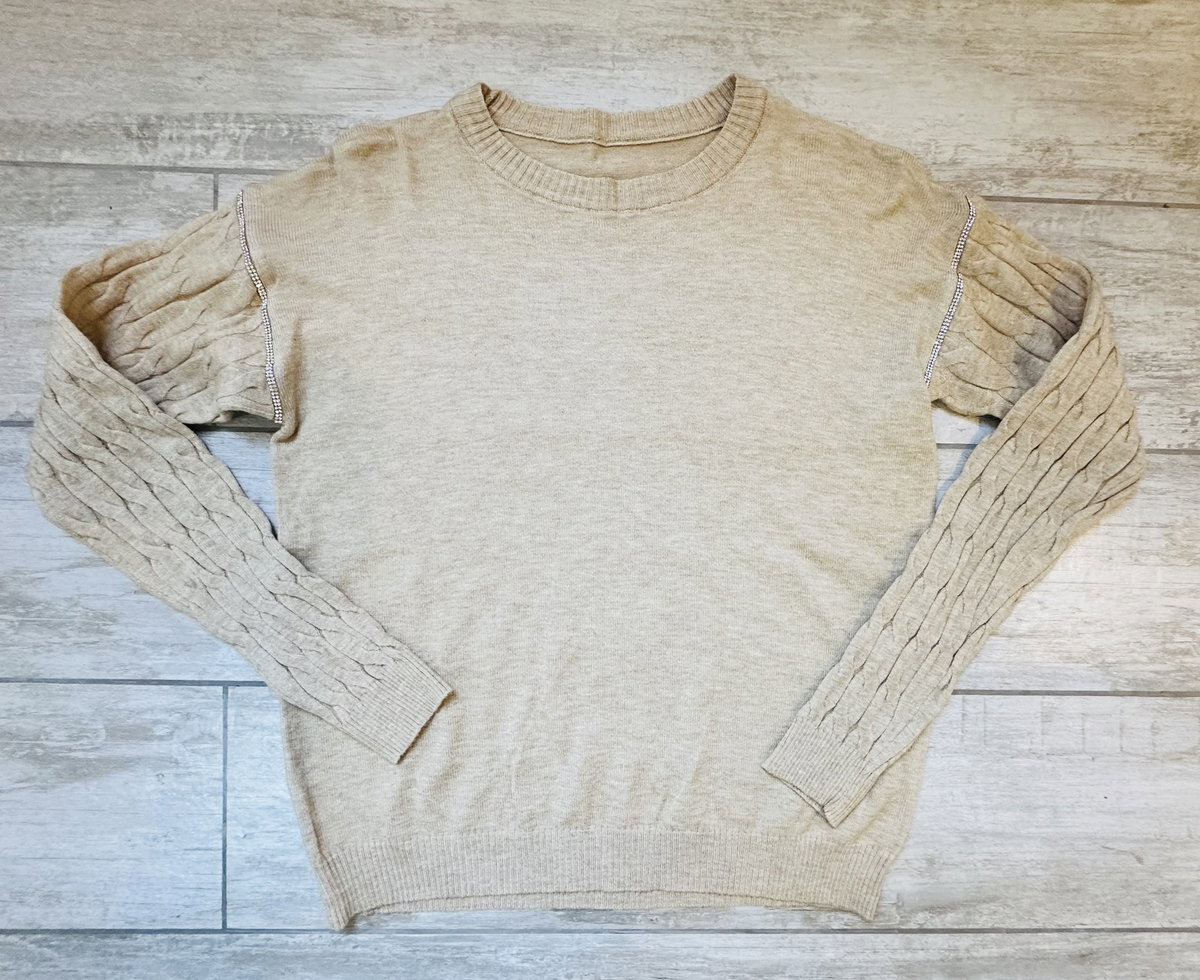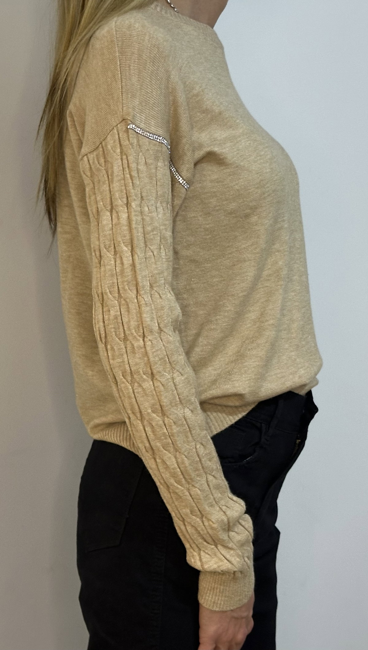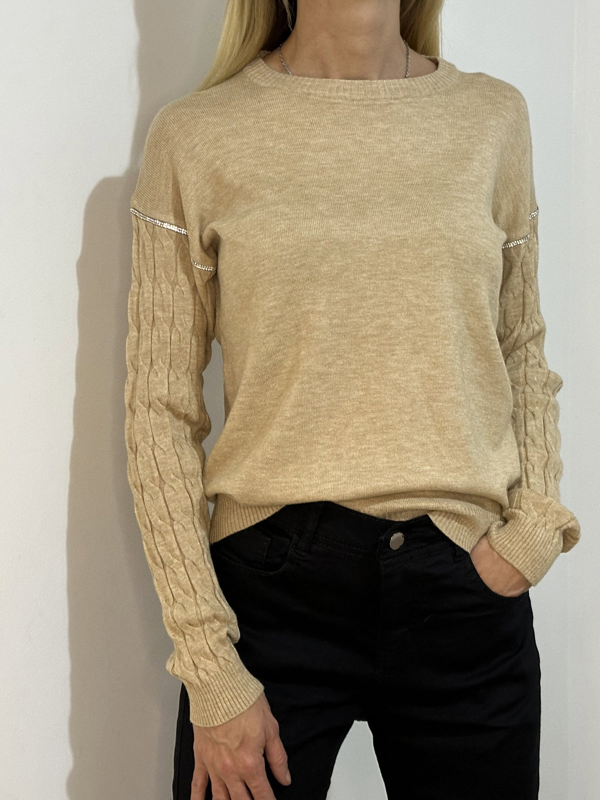 Un básico que se eleva con detalles únicos. Este suéter confeccionado en bremer con lycra se adapta suavemente al cuerpo, brindando calidez y comodidad sin perder elegancia. Las mangas presentan un diseño fruncido con textura acanalada y delicadas costuras con brillo que suman un toque sutil de luz. Ideal para looks relajados con personalidad o para elevar cualquier outfit neutro.