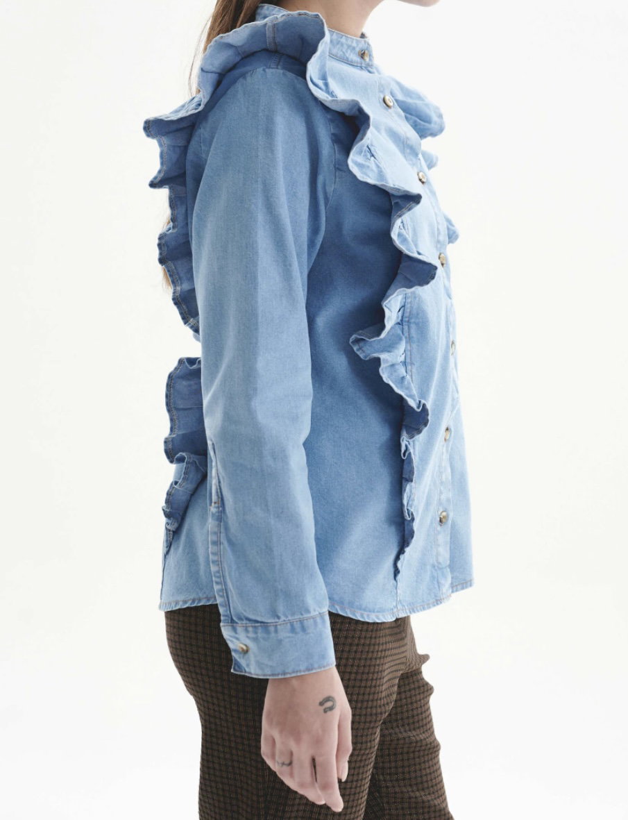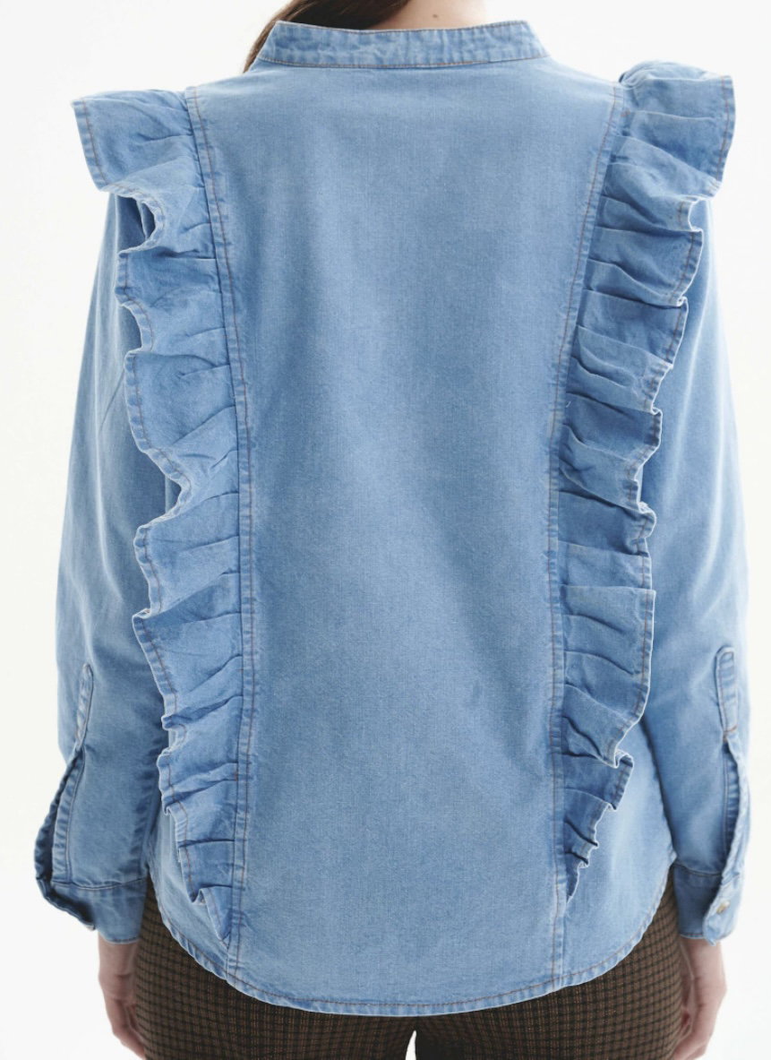 ✨️ Romántica, urbana, poderosa. Esta camisa de denim no se parece a ninguna otra: tiene volados que enmarcan el frente y recorren toda la espalda, creando una silueta con movimiento y presencia.