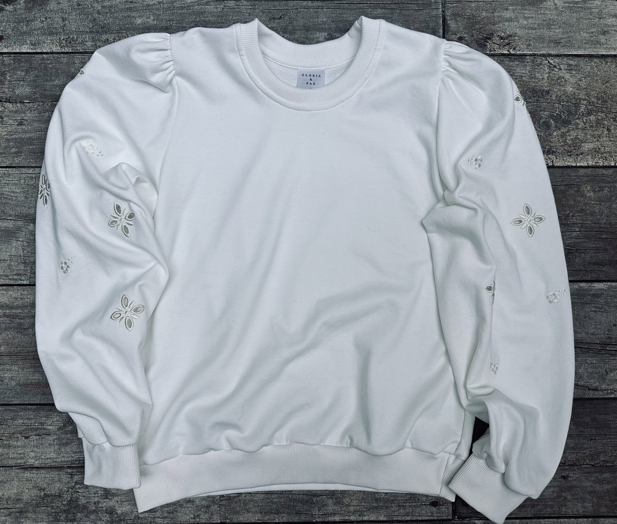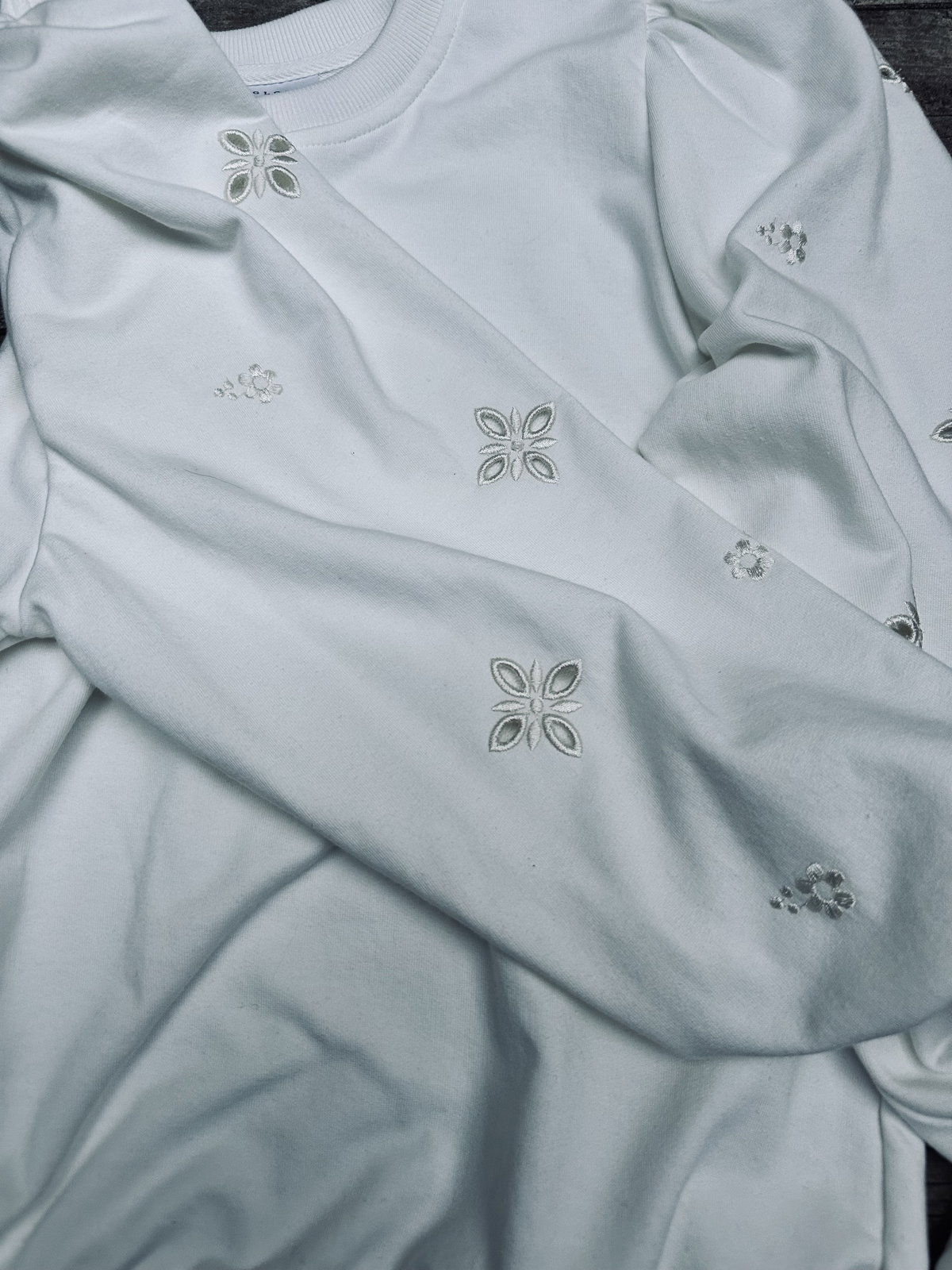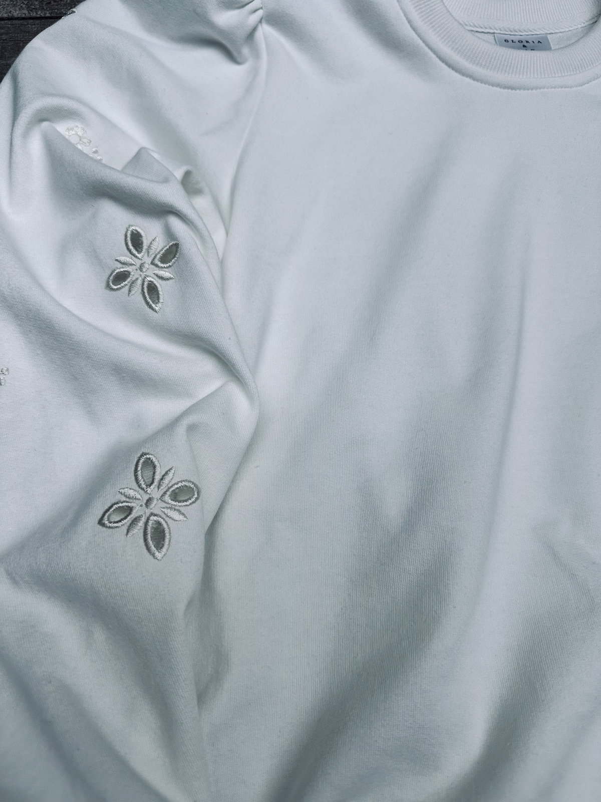 Buzo blanco con mangas bordadas y hombros ligeramente fruncidos para generar un corte princesa. Sutil, femenino y con ese detalle que hace la diferencia.