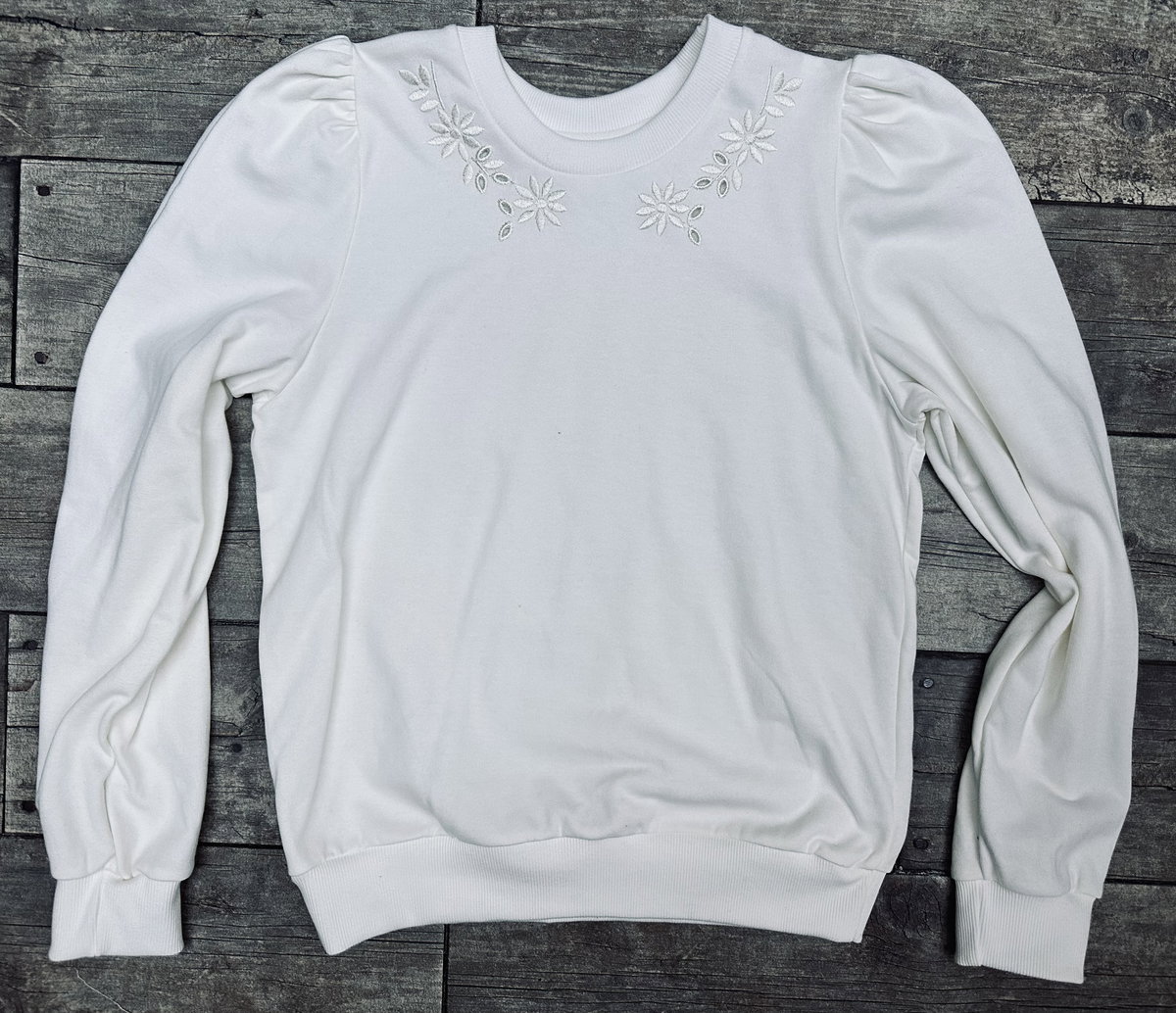 Blanco puro, hombros fruncidos y un bordado floral con calado que enmarca el cuello y levanta cualquier look.