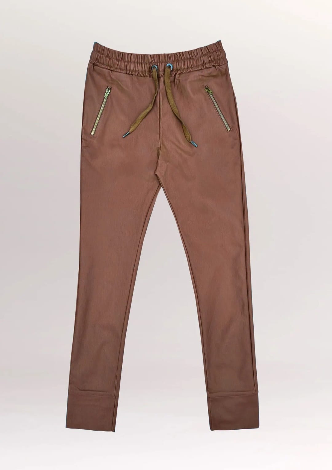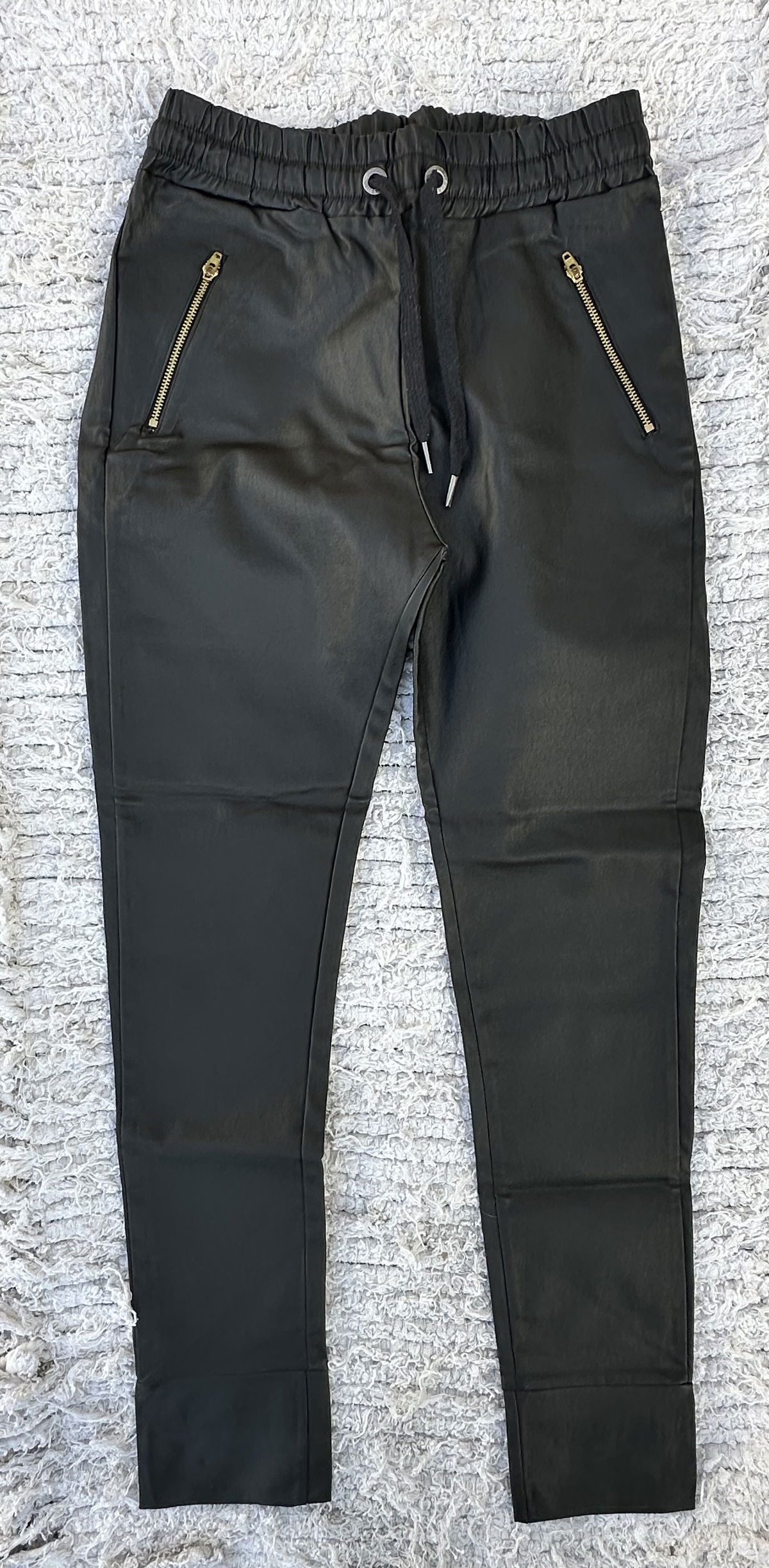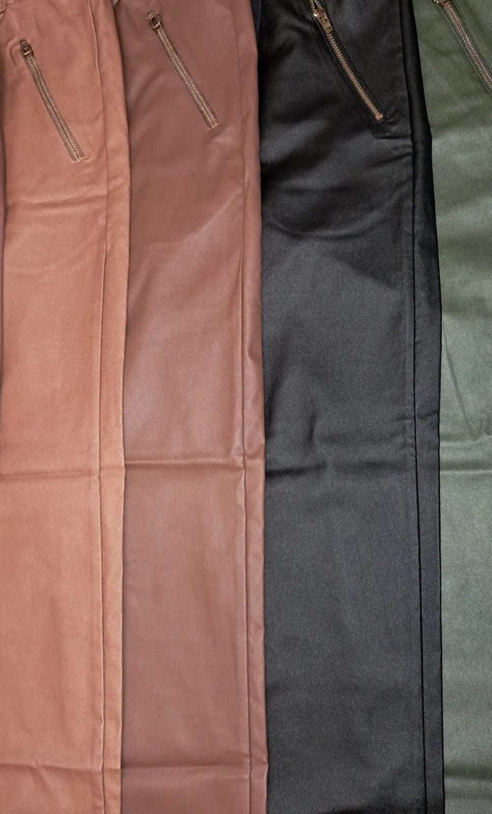 Babucha en bengalina con acabado efecto cuero, cómoda, canchera y con ese brillo justo que levanta cualquier look. Tiene cintura elastizada con lazo, cierres dorados y un calce que estiliza sin apretar.