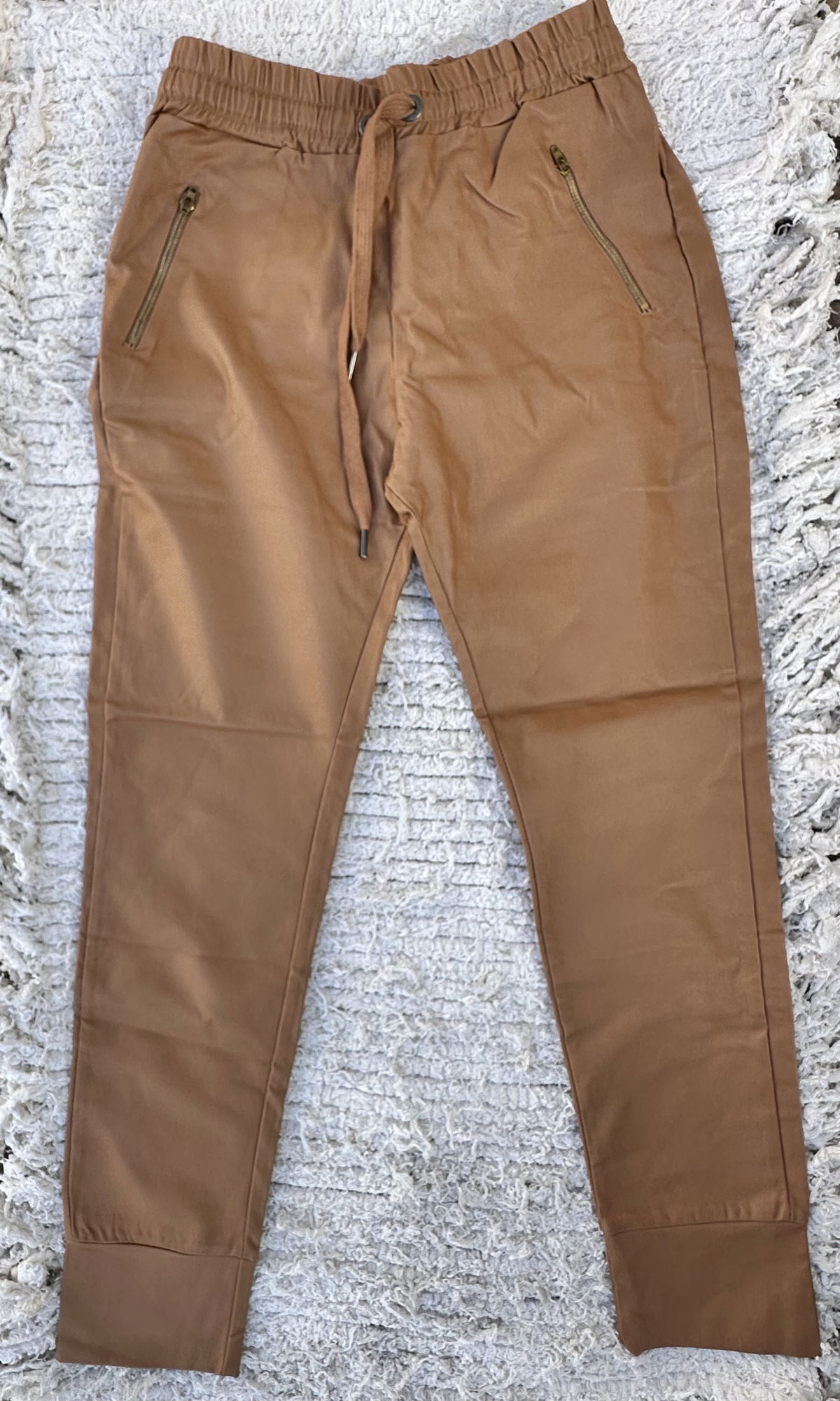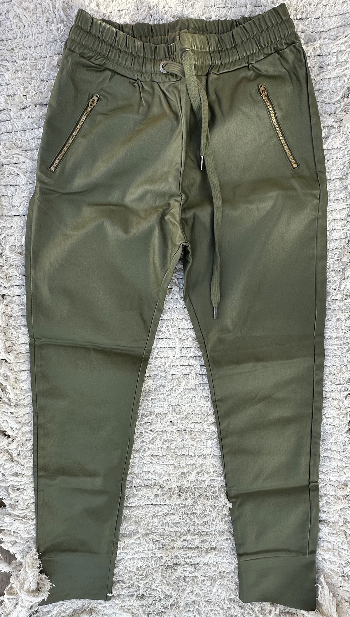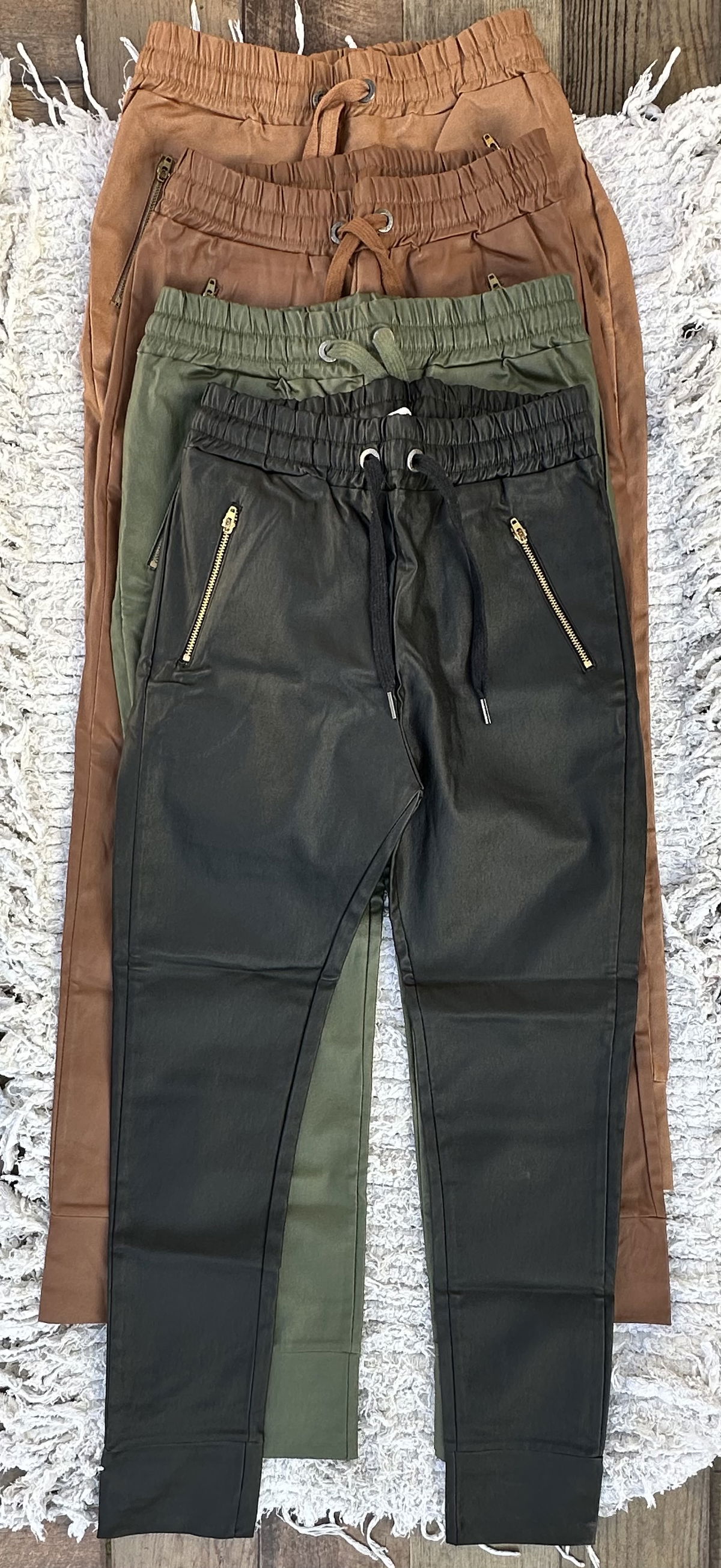 Babucha en bengalina con acabado efecto cuero, cómoda, canchera y con ese brillo justo que levanta cualquier look. Tiene cintura elastizada con lazo, cierres dorados y un calce que estiliza sin apretar.