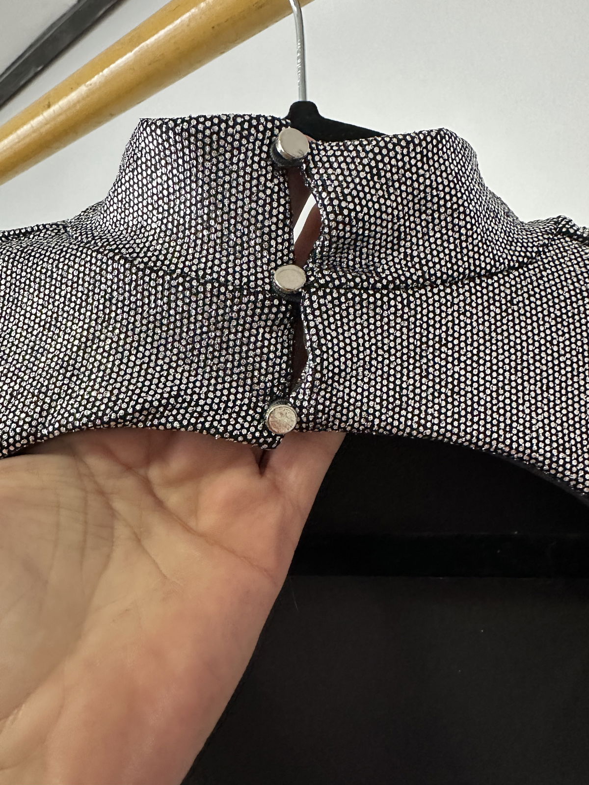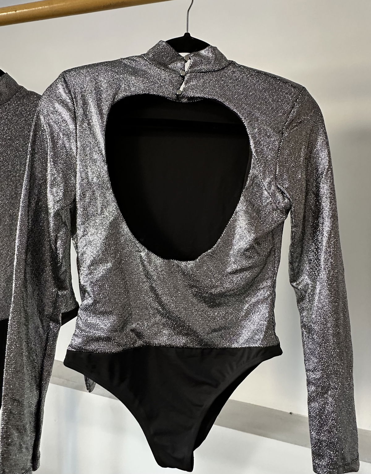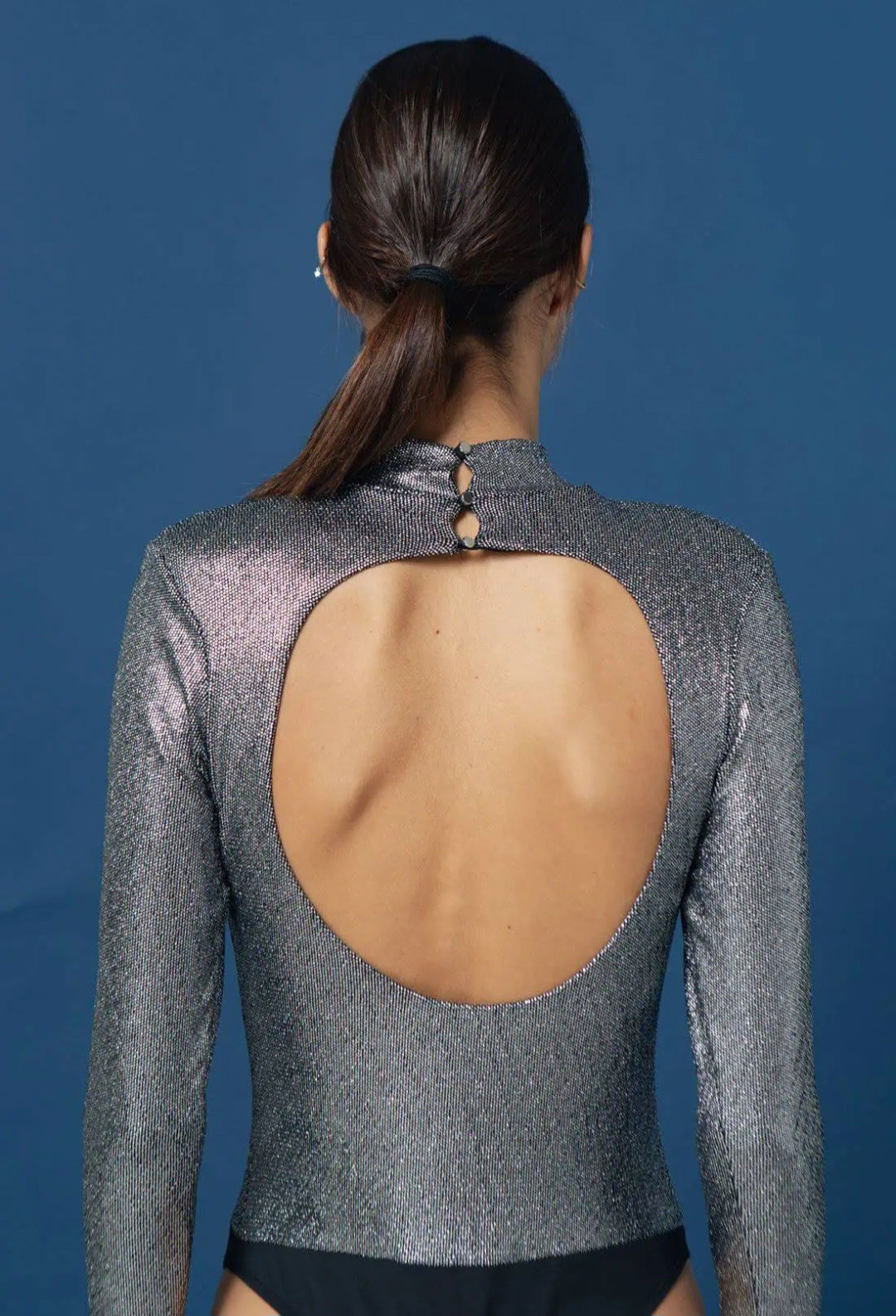 Cuando el look necesita impacto, este body es la respuesta. Con brillo metalizado, hombreras estructuradas, escote profundo en la espalda y botones metálicos en el cuello, este modelo lo tiene todo. Es elastizado y forrado, lo que lo hace cómodo y sentador.