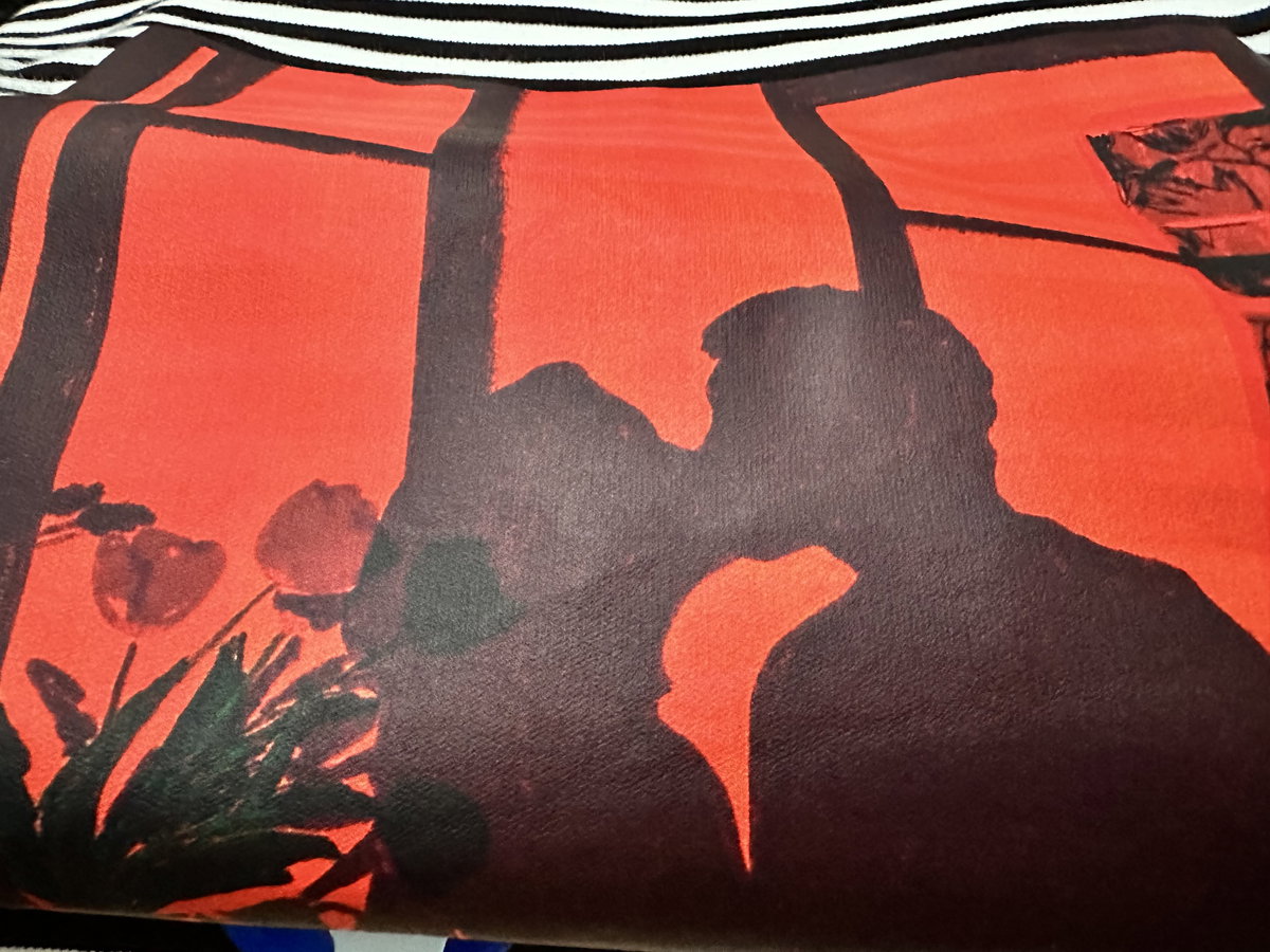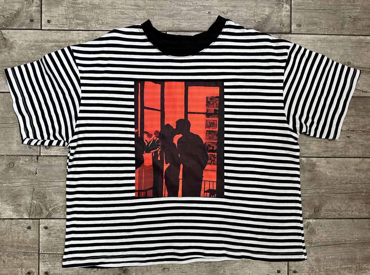 Algodón importado, corte oversize y cuello negro que contrasta. Estampa tipo postal con una escena romántica en rojo vibrante que hace que esta remera hable por sí sola. Una prenda con actitud y mucho estilo.