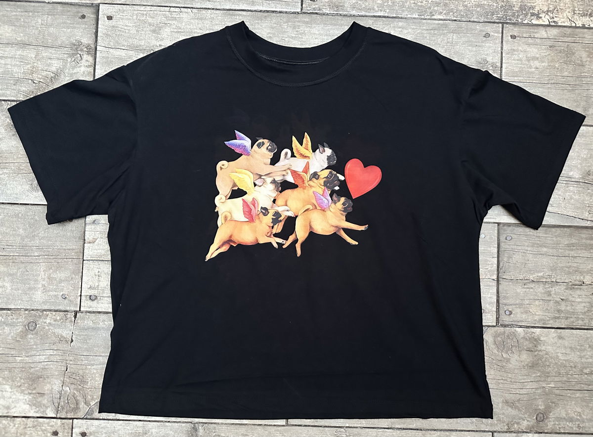 De algodĂłn negro importado y corte oversize. Estampa con carlinos voladores (ÂĄsĂ, con alas!) y un corazĂłn rojo vibrante que le suma un toque kitsch y adorable. Una prenda que levanta el ĂĄnimo y cualquier outfit đđś