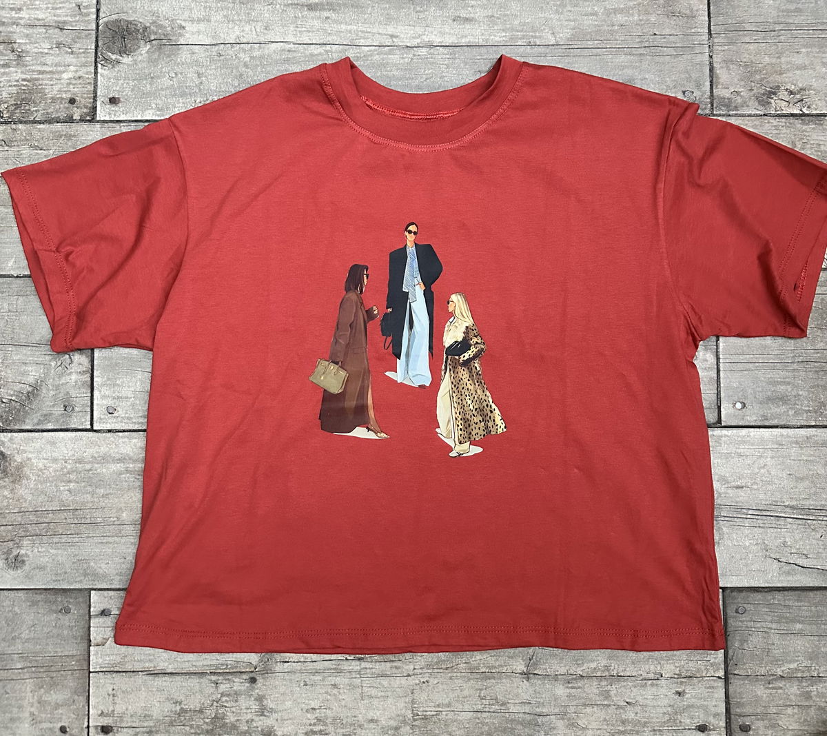 Remera roja de algodón importado, con corte oversize. Estampa central con tres figuras femeninas en looks de alto impacto: maxi tapados, gafas y actitud. Una prenda que celebra la moda, la charla y el street style.