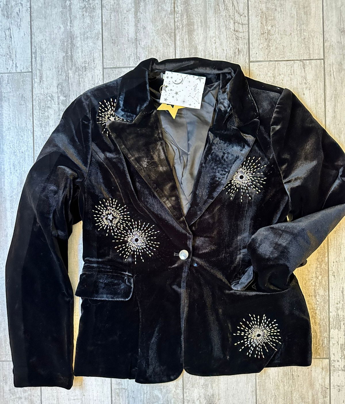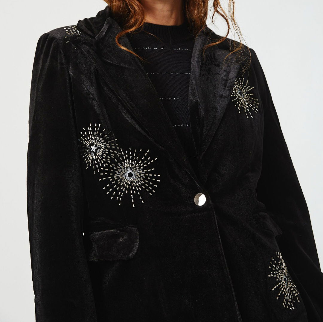 Confeccionado en terciopelo negro con textura suave, tiene bordados de canutillos que son TODO!. Cada detalle suma lujo, personalidad y ese factor wow que transforma cualquier look.