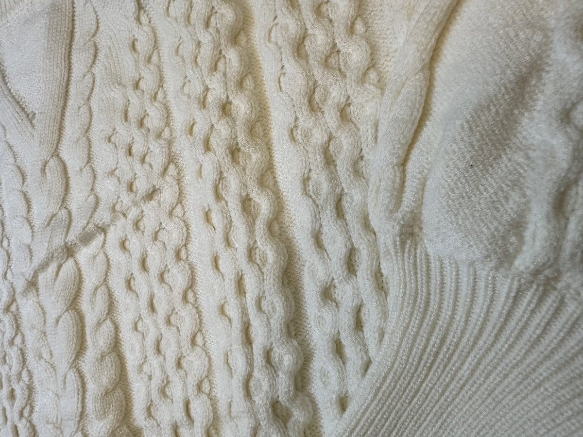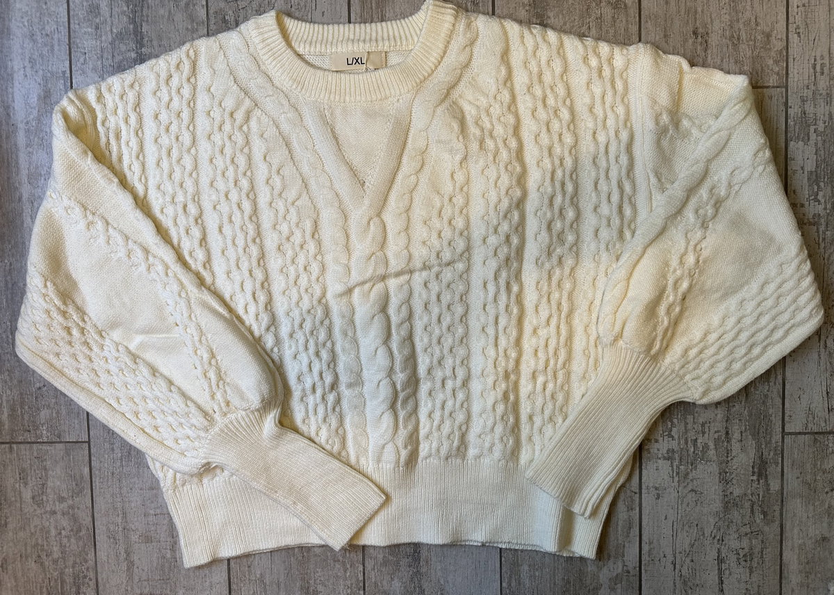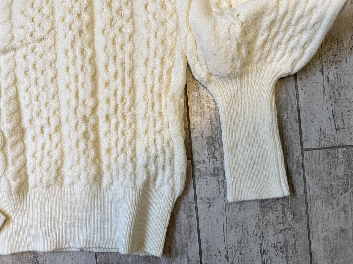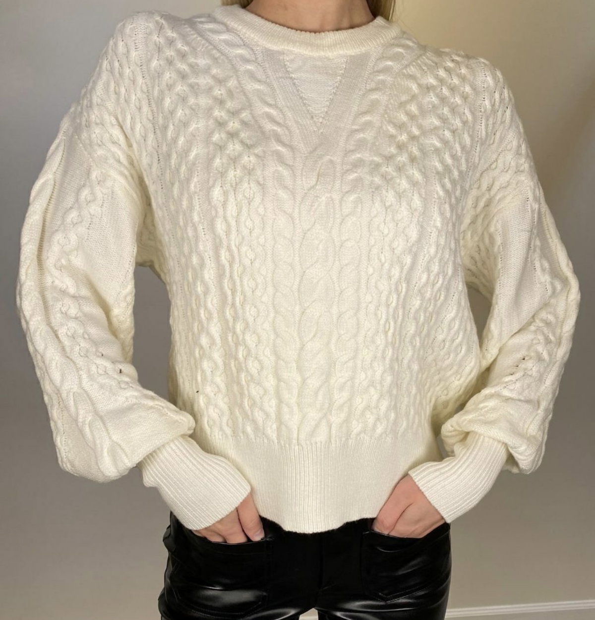 Elegancia en cada punto. Este sweater en tono off-white se destaca por su tejido trenzado en relieve y mangas con puño ajustado que crean un efecto globo sutil y femenino. Su diseño atemporal y calce relaxed lo convierten en un must-have para elevar cualquier look con textura y sofisticación.