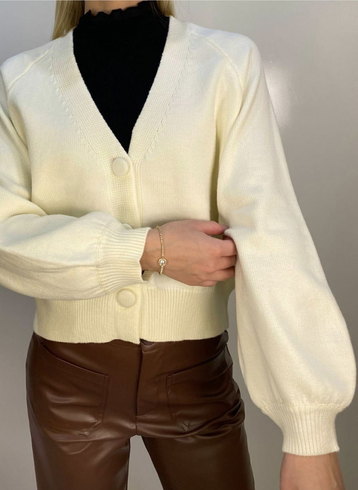 Un básico elevado al siguiente nivel. Este cardigan en tono off-white destaca por sus mangas globo con puño ajustado que aportan volumen y un aire femenino irresistible. Los botones forrados en tejido le dan un toque minimalista y sofisticado, perfecto para usar solo o como capa sobre cualquier outfit.
