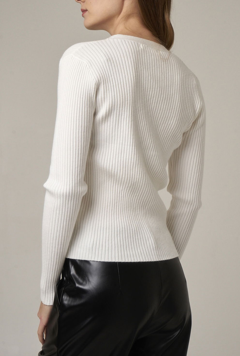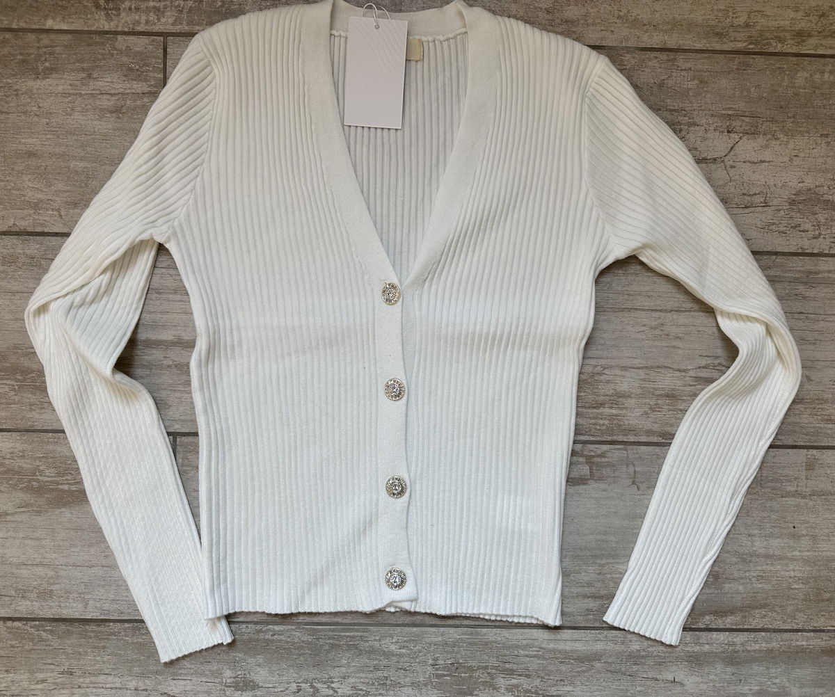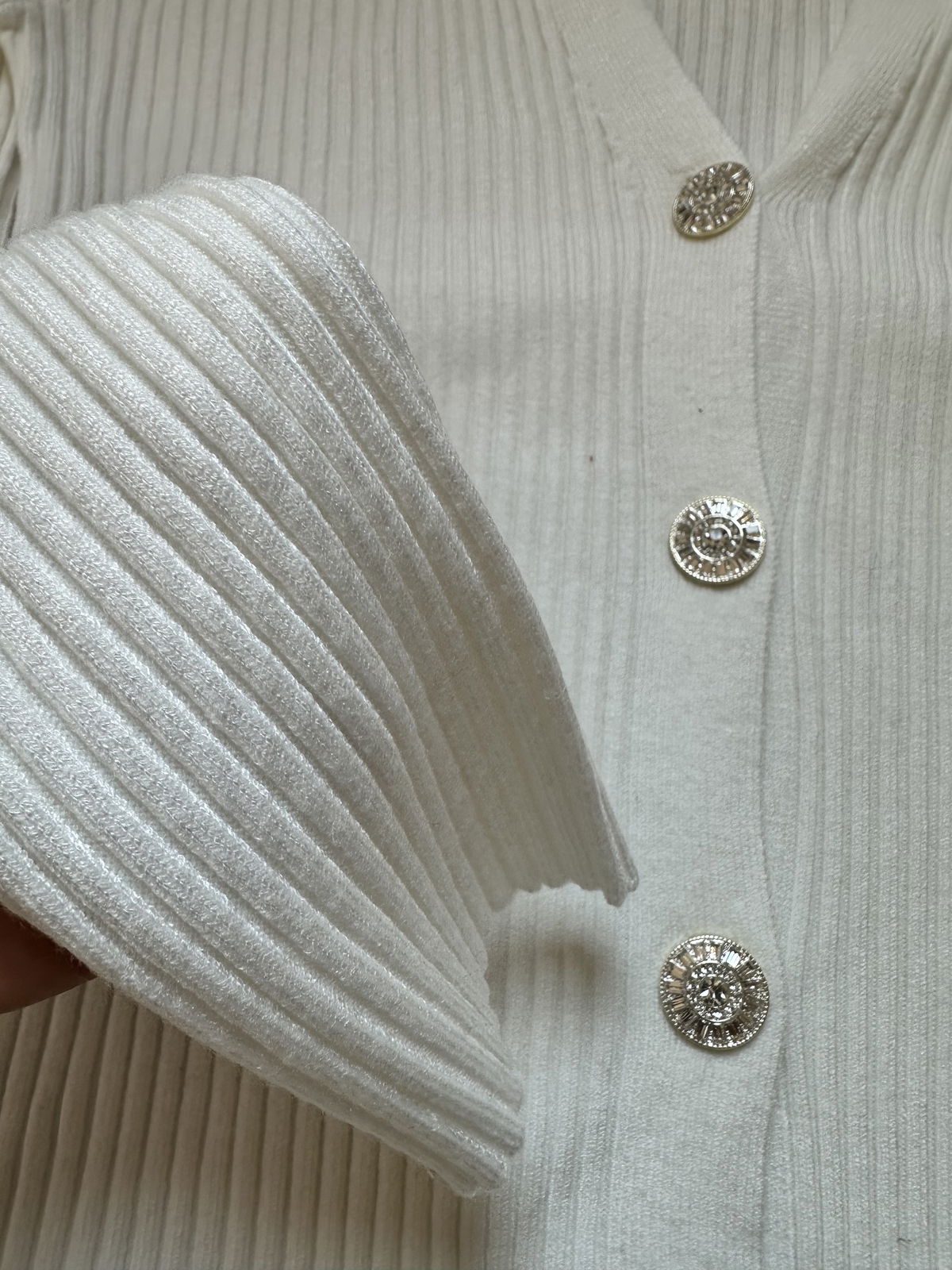 Minimalismo y lujo en una sola prenda. Este cardigan de tejido acanalado tiene un calce ajustado que estiliza la figura y botones tipo joya que aportan un brillo sutil y sofisticado. Perfecto para usar solo como top o abierto sobre un outfit elegante. Disponible en blanco y negro, los dos imprescindibles del guardarropa.