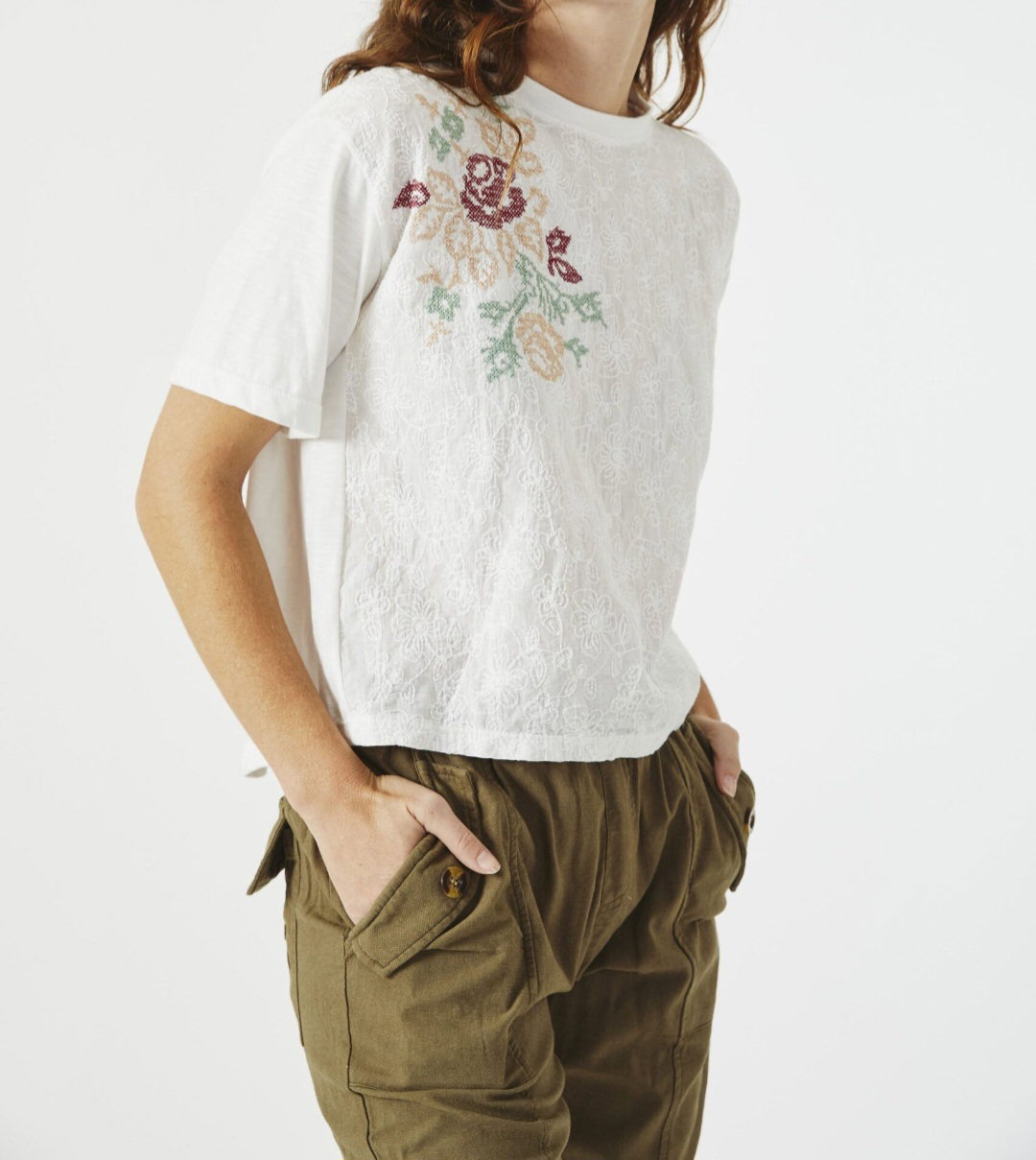 Tiene ese aire vintage que la hace única: base de algodón con textura floral bordada en hilo blanco y un diseño de flores.