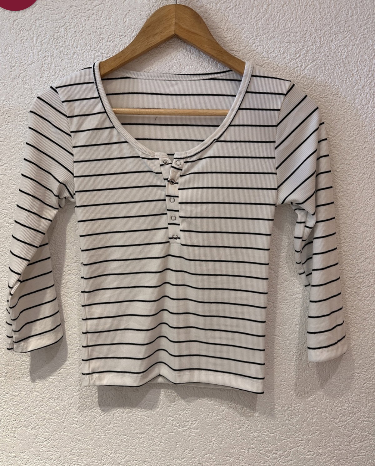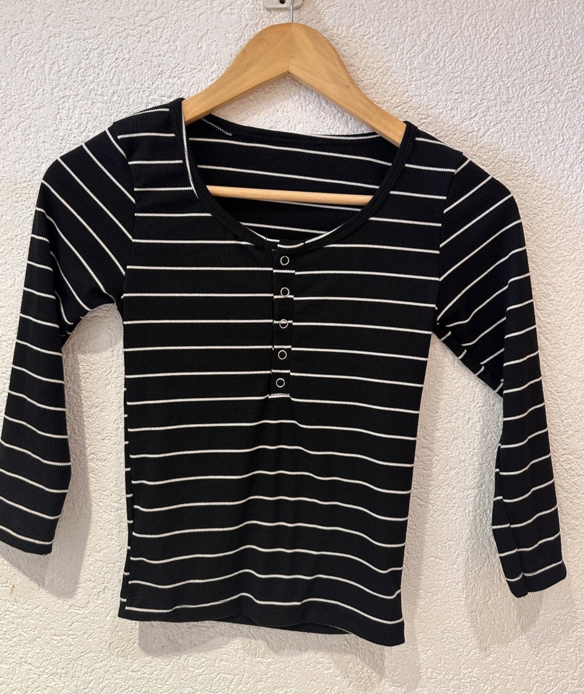 El básico canchero que va con todo. Confeccionada en rib súper cómodo, esta remera de rayas finas tiene escote redondo y detalle de botones en el frente que la hacen diferente y súper versátil. Ideal para usar sola o como base en capas, en looks casuales o más arreglados. Disponible en blanco y negro.