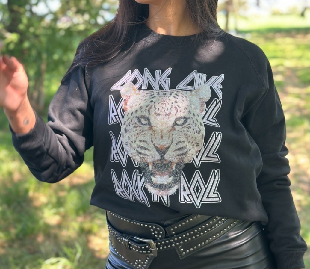 Confeccionado en algodón rústico suave, tiene una estampa de leopardo y letras tipo rock que gritan personalidad.