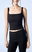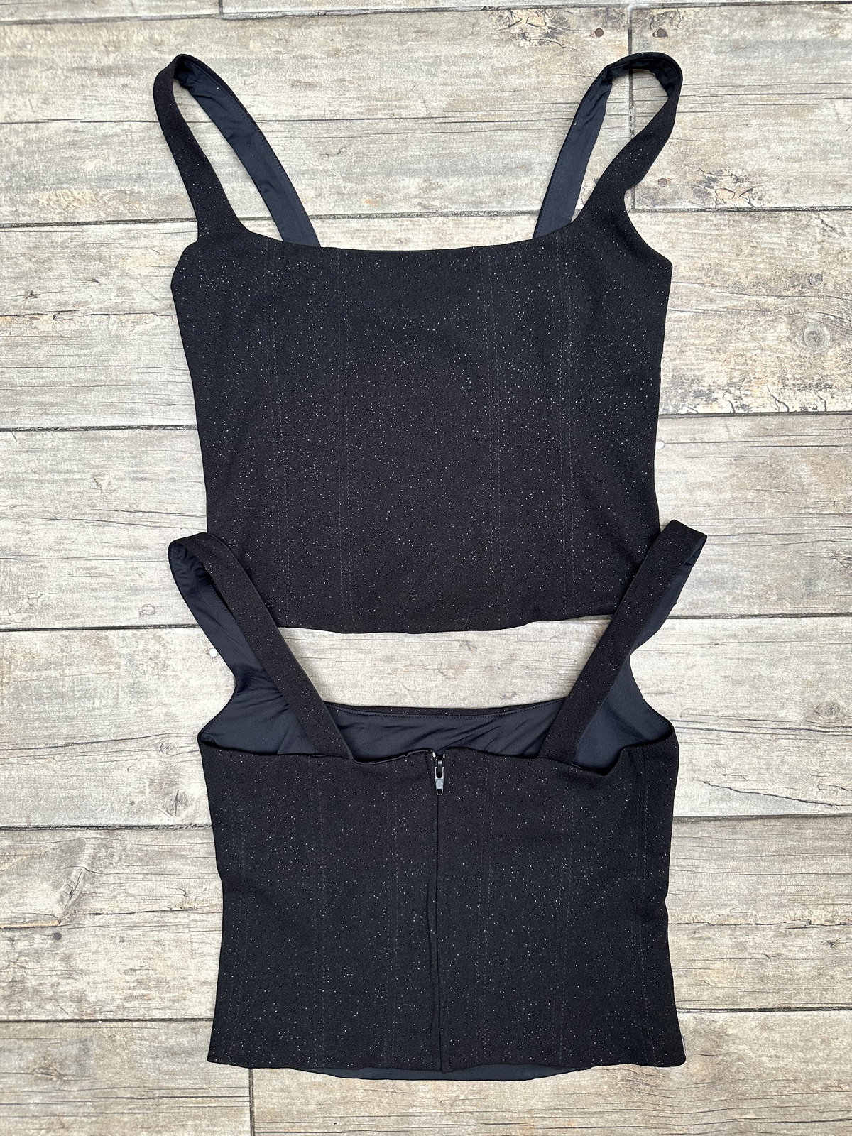 Top negro de tela con destellos metalizados, elegante y delicado.