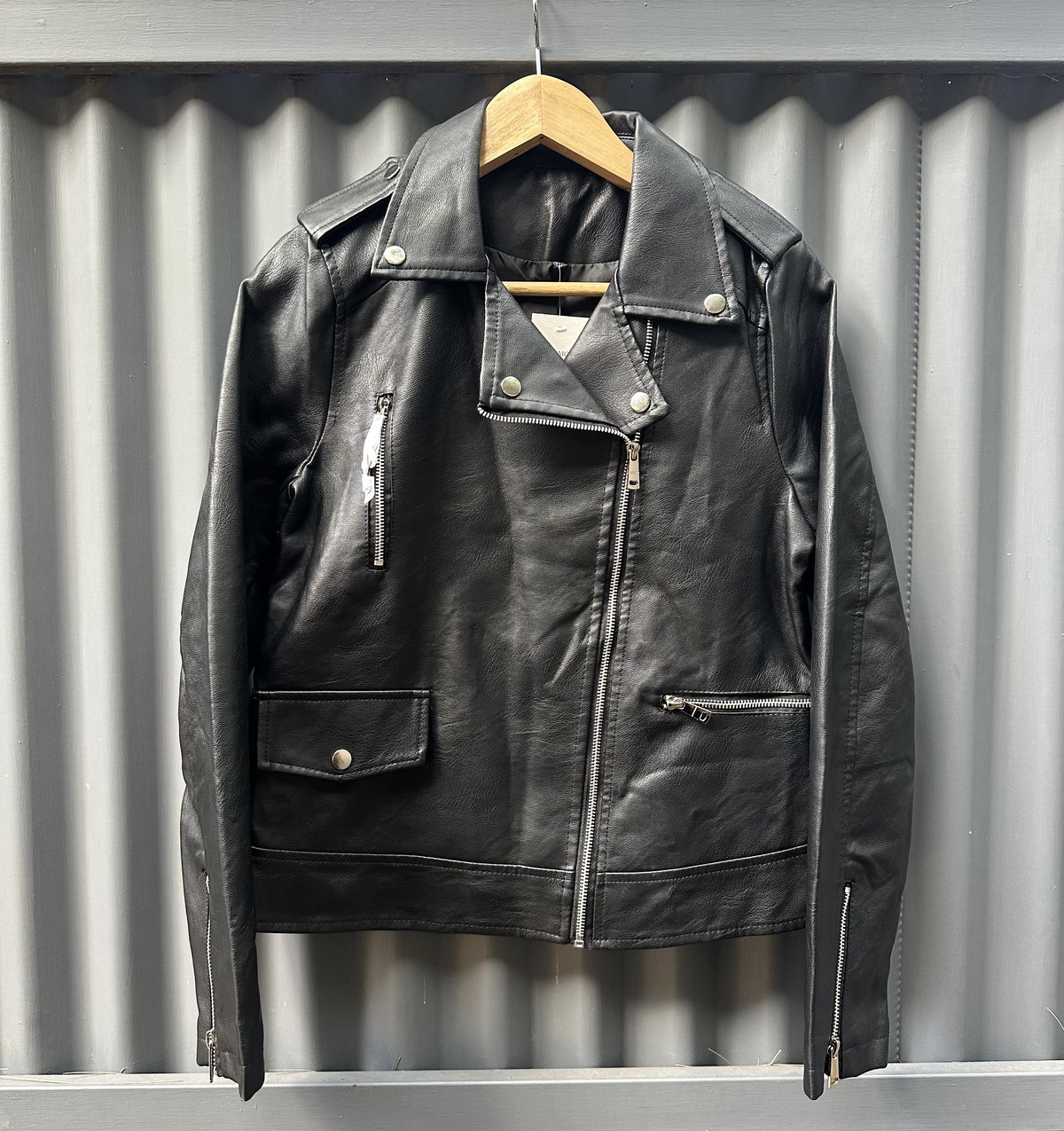 Un clásico que suma carácter al instante. Campera de ecocuero negro con diseño biker y cierre cruzado, bolsillos con cierre y detalles metálicos que realzan el look. Versátil y canchera, perfecta para acompañar desde un jean hasta un vestido.