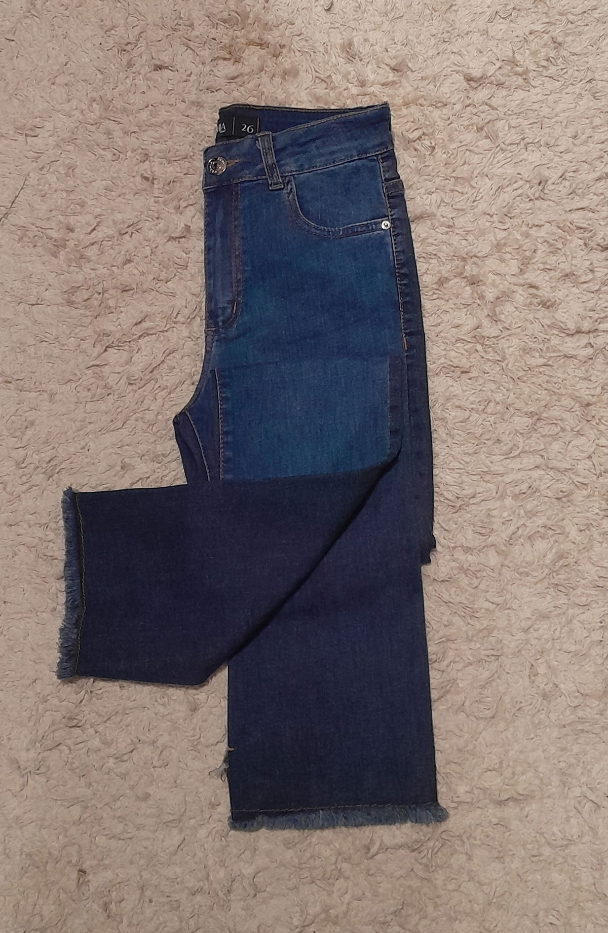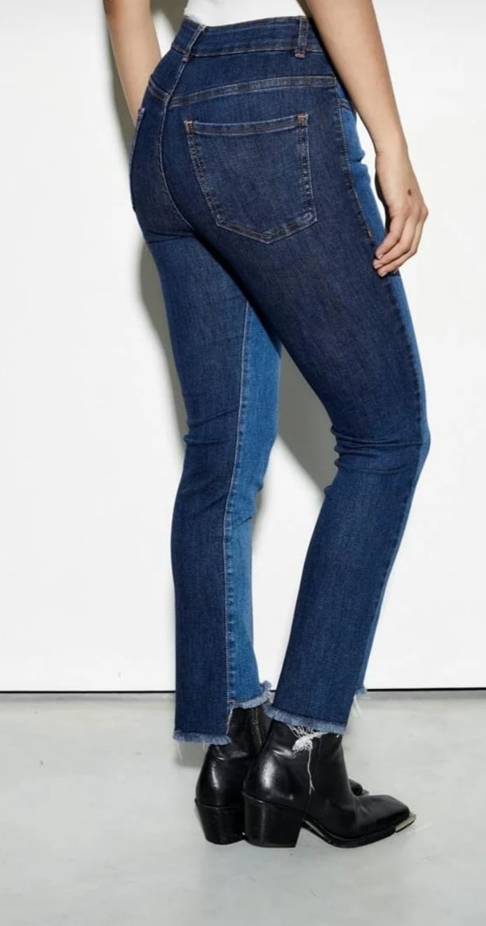 Jean elastizado bicolor. Parte delantera azul gastado y azul pleno en la parte trasera. Posee detalle de corte y desflecado en botamanga.