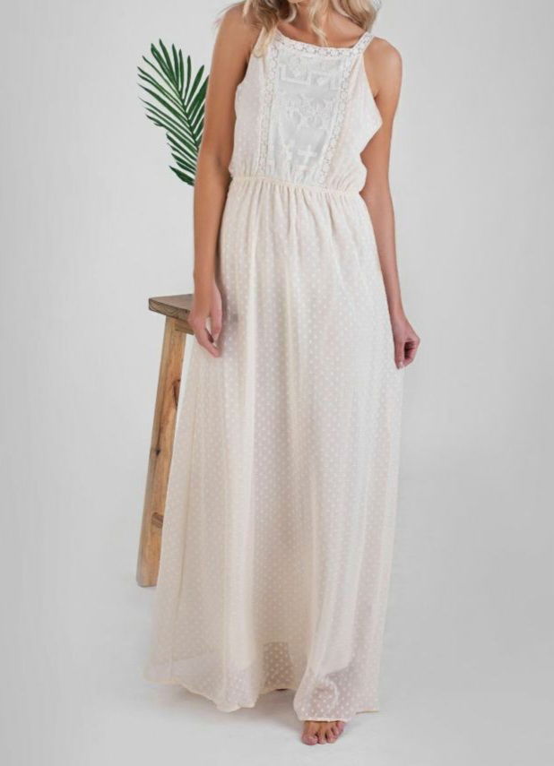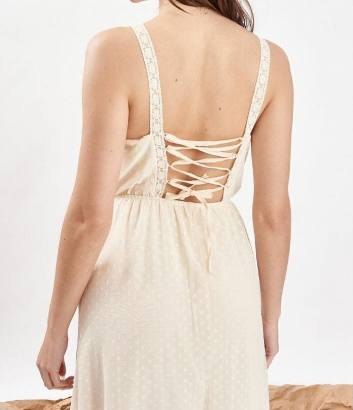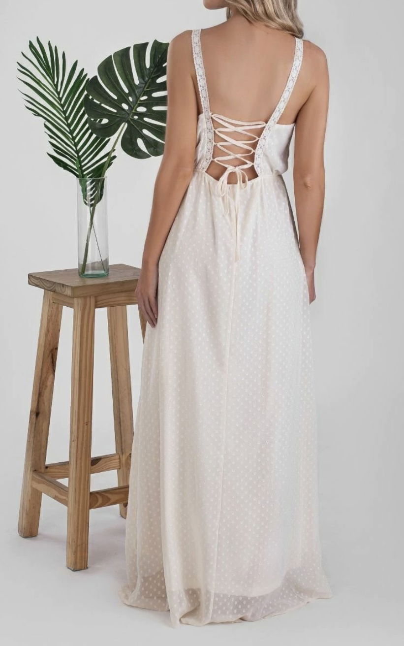 ✨ Vestido largo off white – un diseño etéreo y delicado que enamora. Confeccionado en tela liviana con micro lunares en relieve, detalle de encaje y bordados en el frente. La espalda se luce con un cruce regulable tipo corset que aporta un toque romántico y ajusta perfecto a la silueta. Ideal para un look fresco, bohemio y elegante.