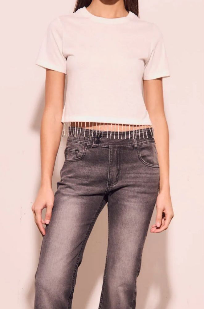 Básica pero con power: algodón suave y cómodo, intervenido con tiras de strass en flecos que le dan ese brillo sutil que levanta cualquier look. Ideal para usar de día con jeans o a la noche con un blazer arriba. Una prenda que va de lo simple a lo wow ✨