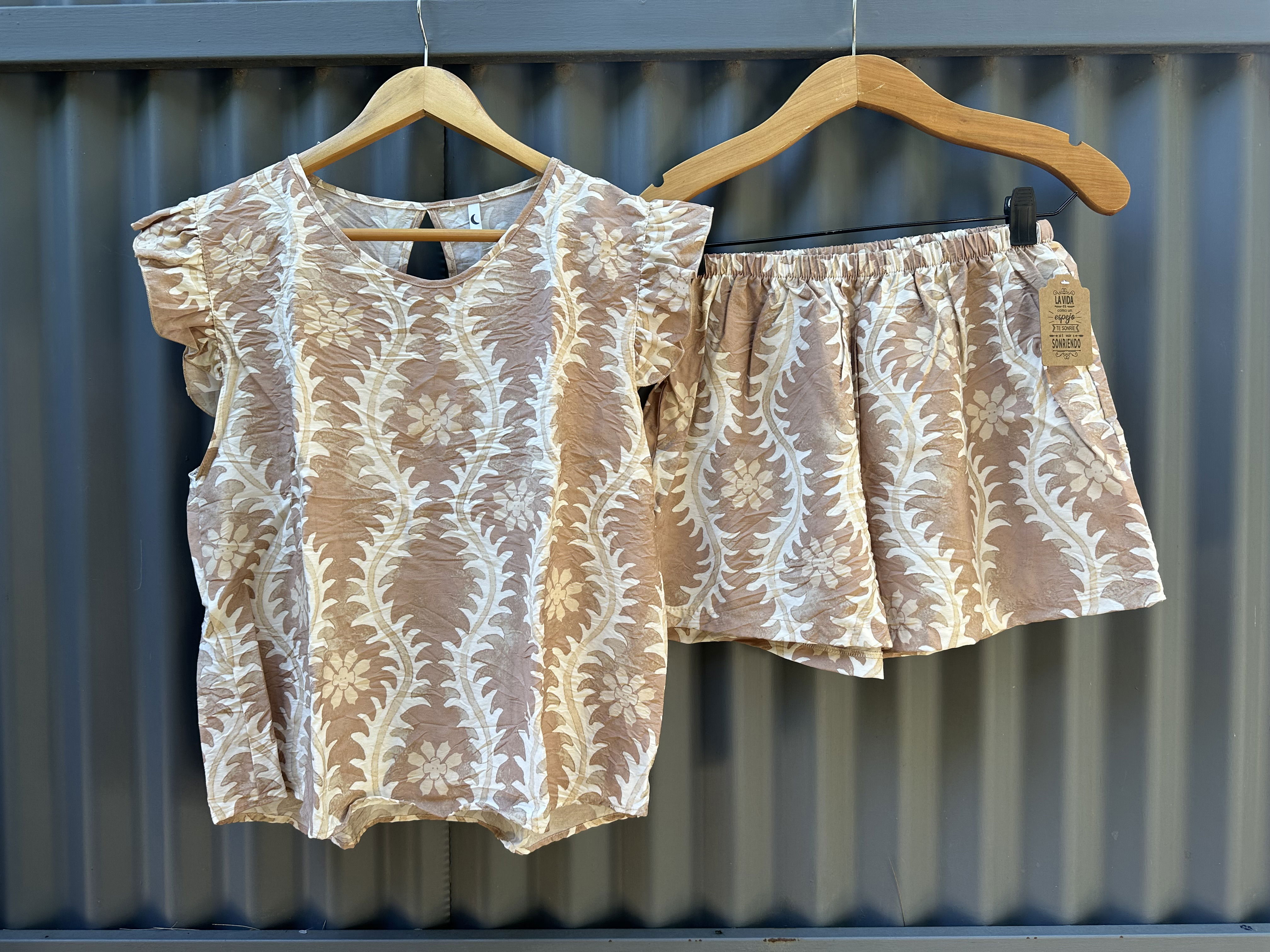 SET CARTAGENA: fresco y liviano de fibrana estampada. Incluye blusa con mangas cortas con voladitos y espalda con abertura, más short con cintura elástica para un calce cómodo. Ideal para los días de calor: suave, aireado y con mucho estilo para estar canchera sin perder comodidad.