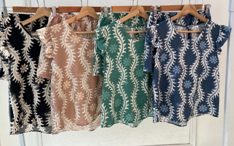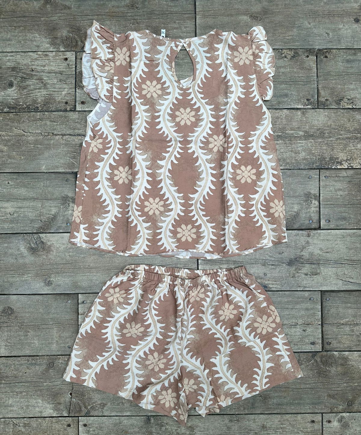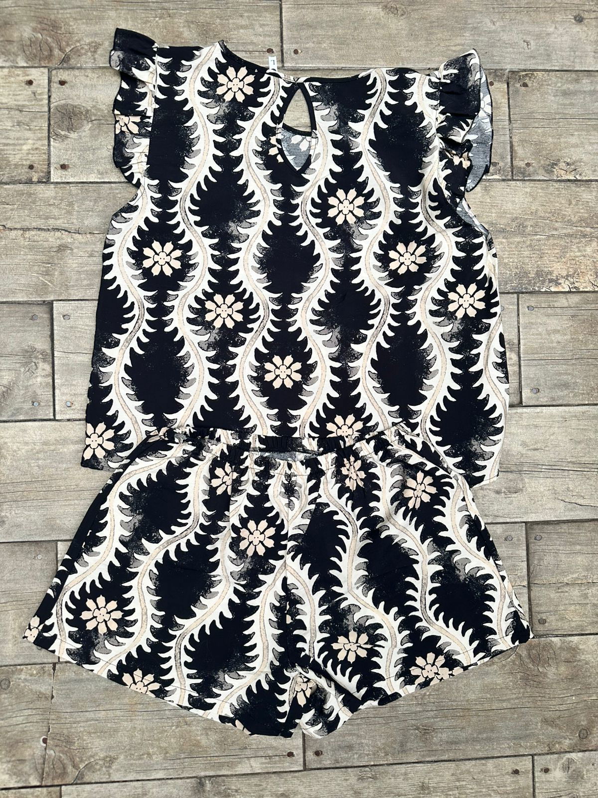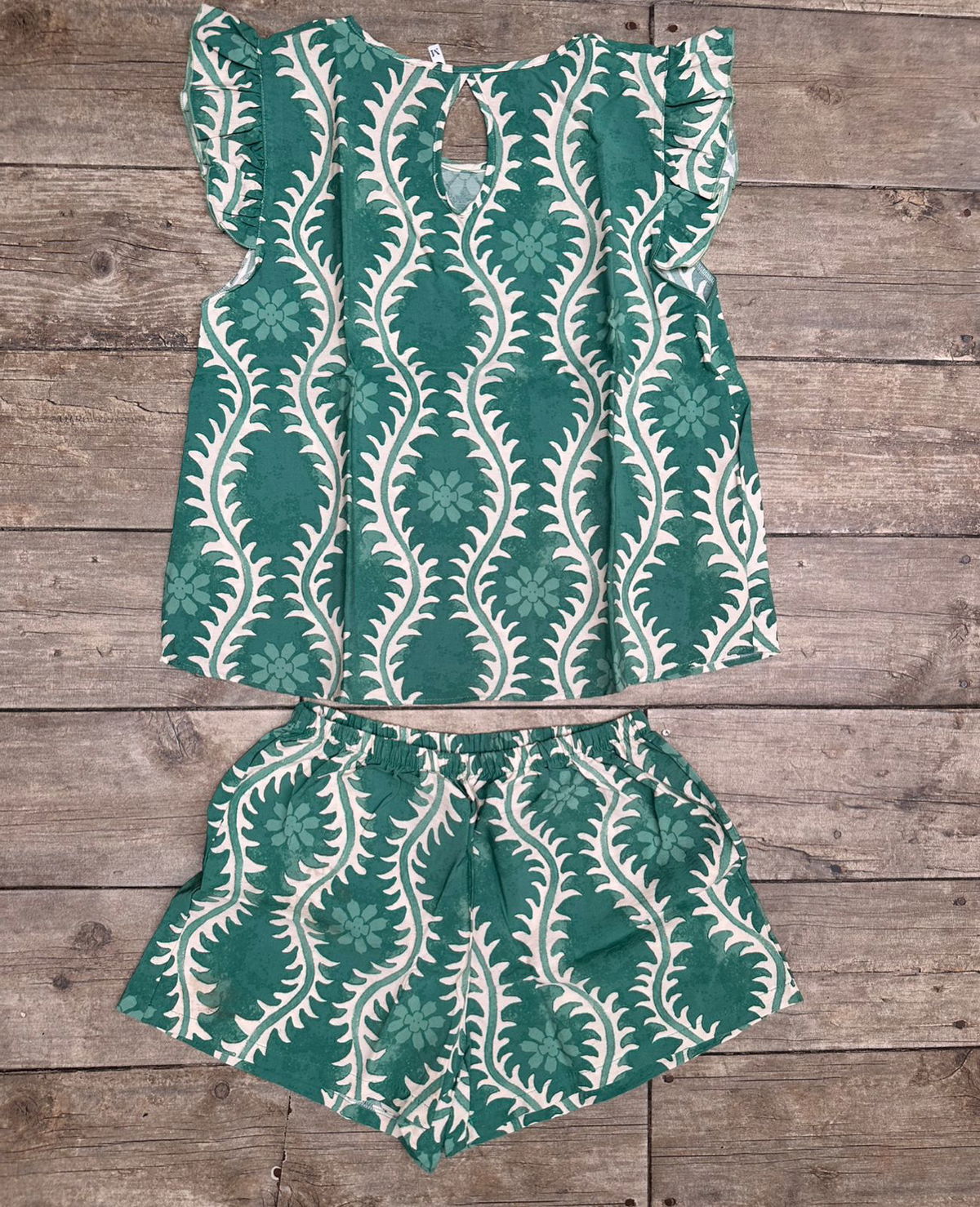 SET CARTAGENA: fresco y liviano de fibrana estampada. Incluye blusa con mangas cortas con voladitos y espalda con abertura, mĂĄs short con cintura elĂĄstica para un calce cĂłmodo. Ideal para los dĂas de calor: suave, aireado y con mucho estilo para estar canchera sin perder comodidad.