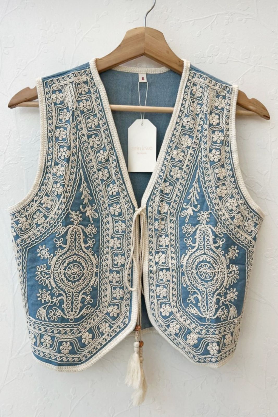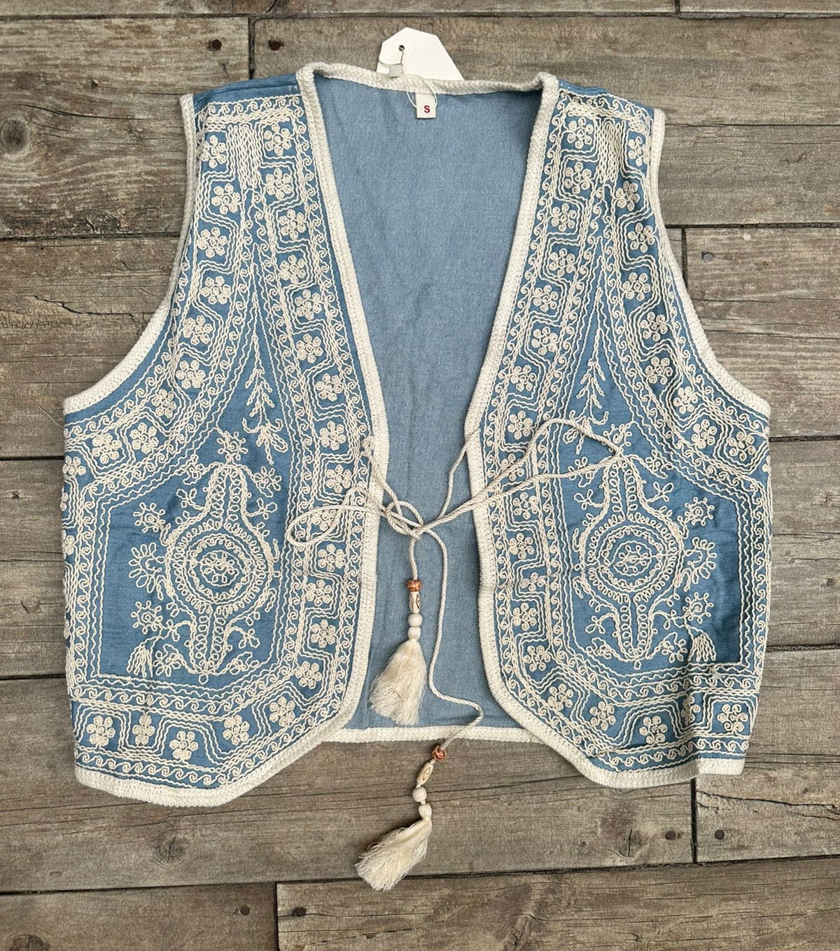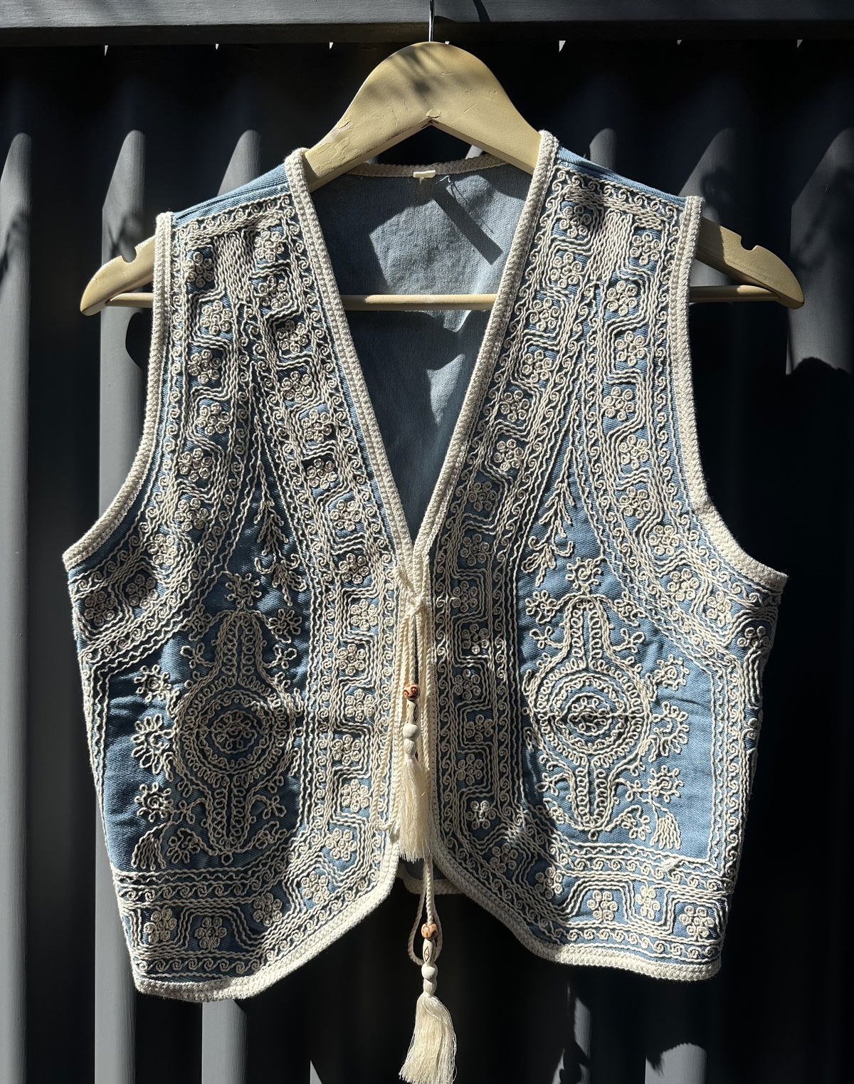 Pieza artesanal, bordado con detalles en hilo crudo y borlas. Un must para looks de verano, ideal para elevar jeans, vestidos o básicos con un toque único.