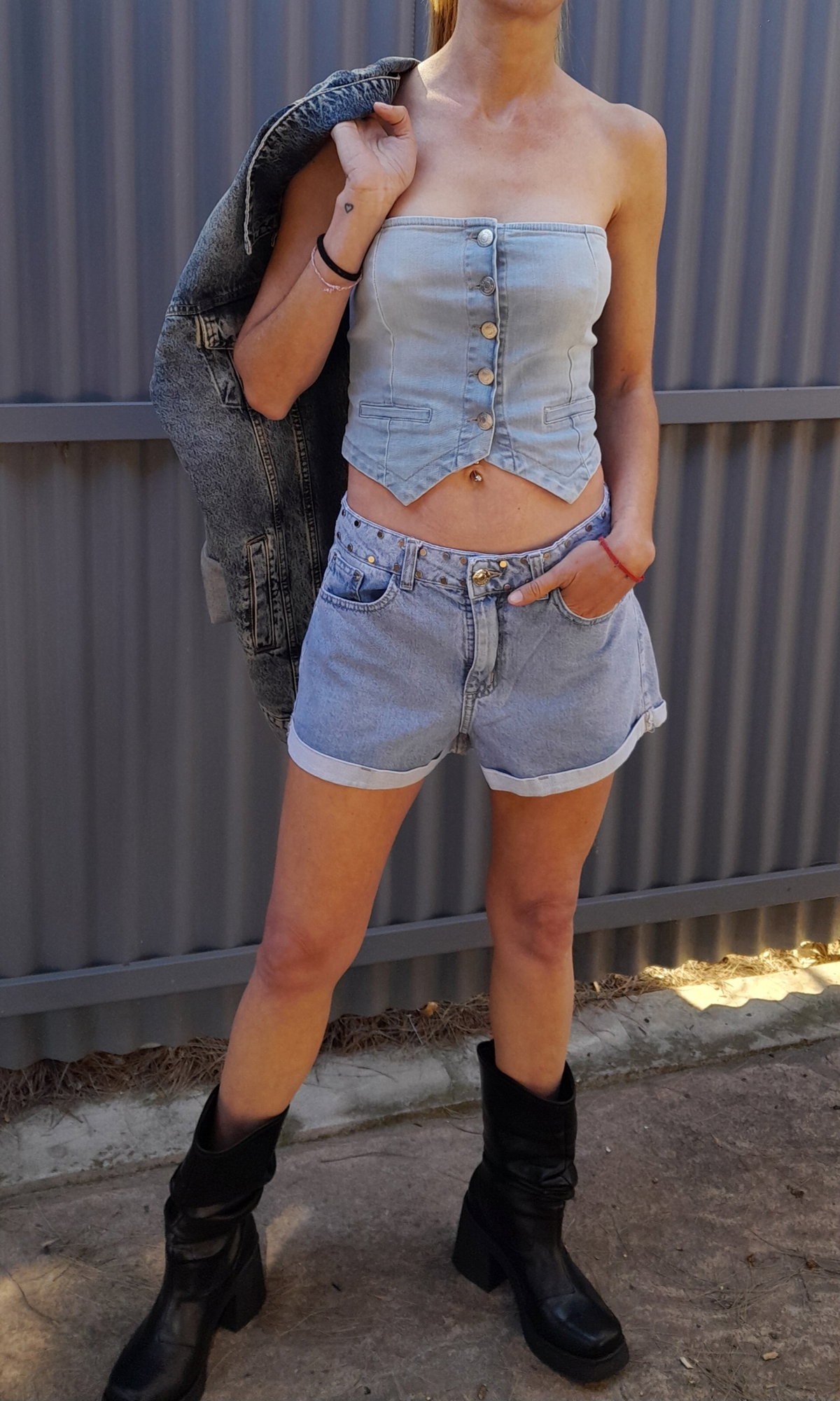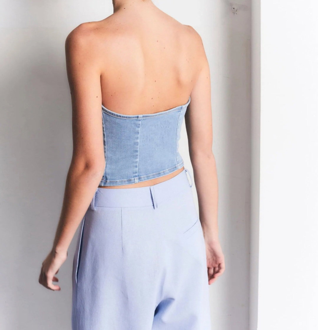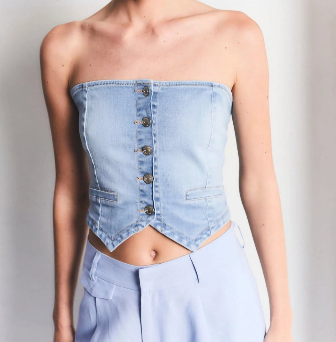 Top estilo corset denim strapless – El jean se reinventa en clave sexy y urbana. Un corset strapless elastizado con botones metálicos y corte en punta que resalta la cintura y deja el abdomen al descubierto.