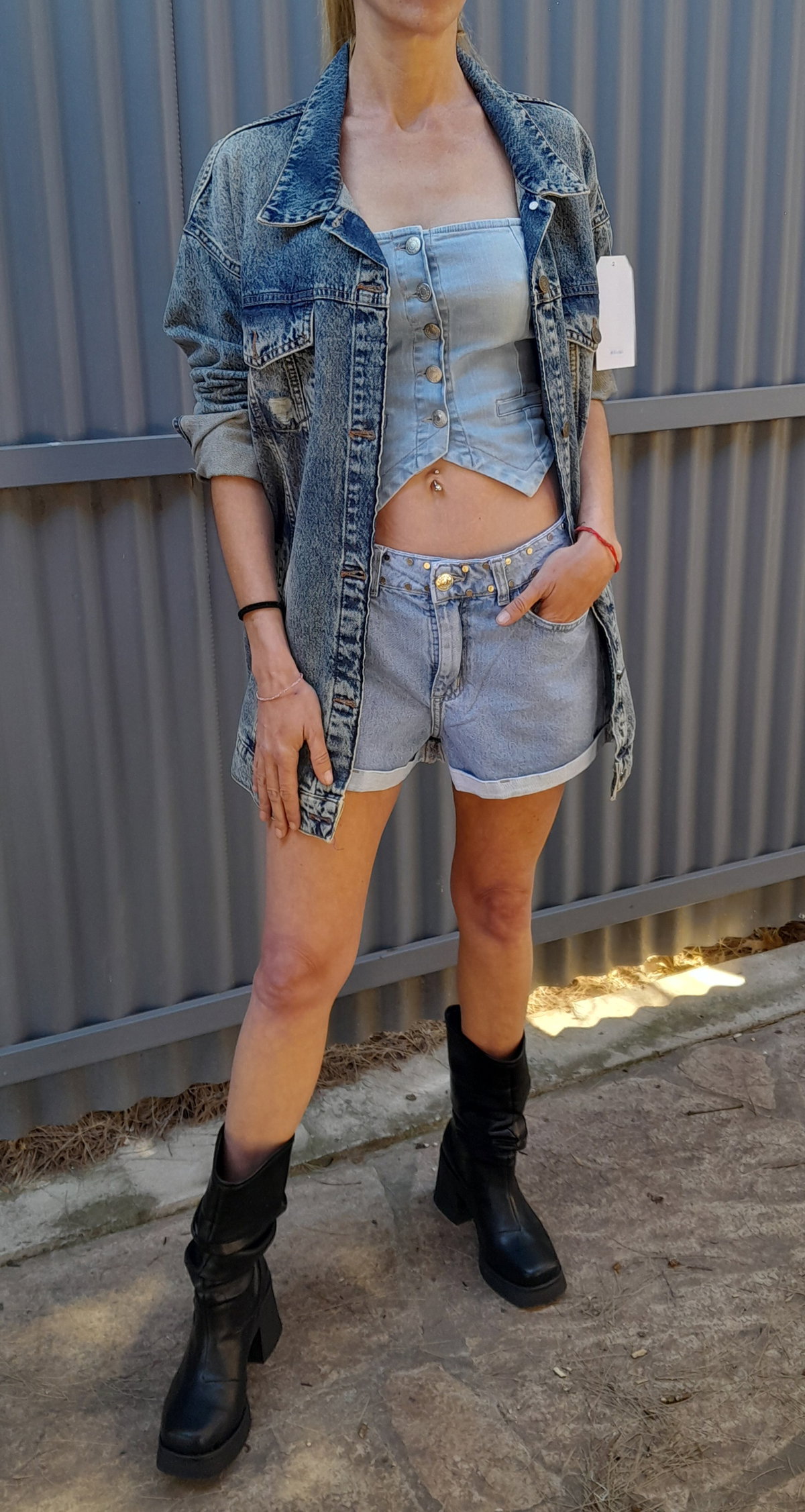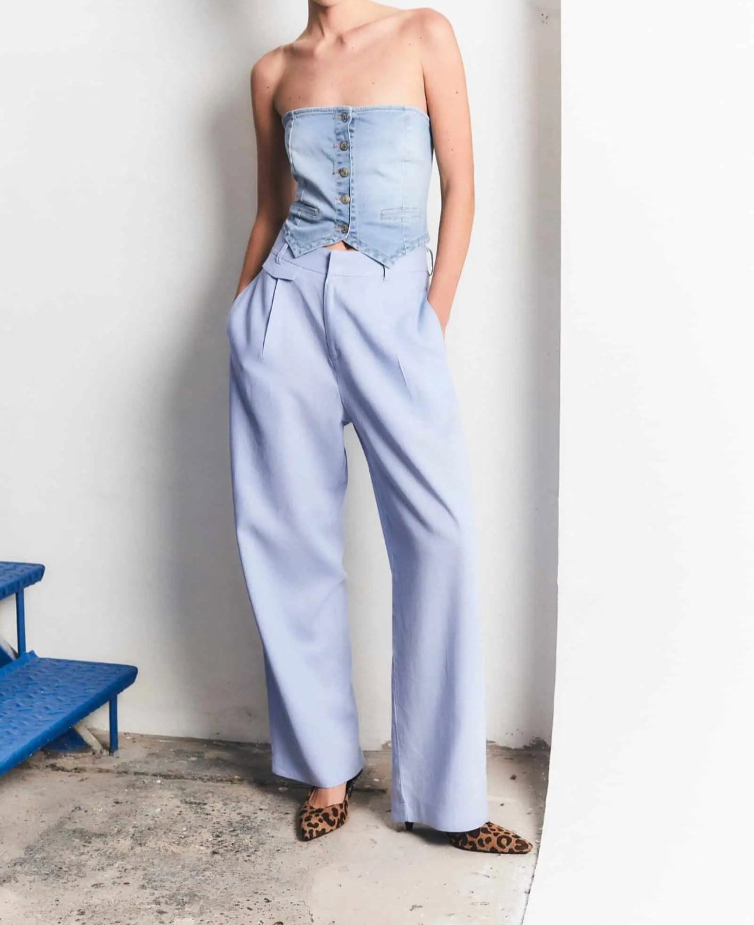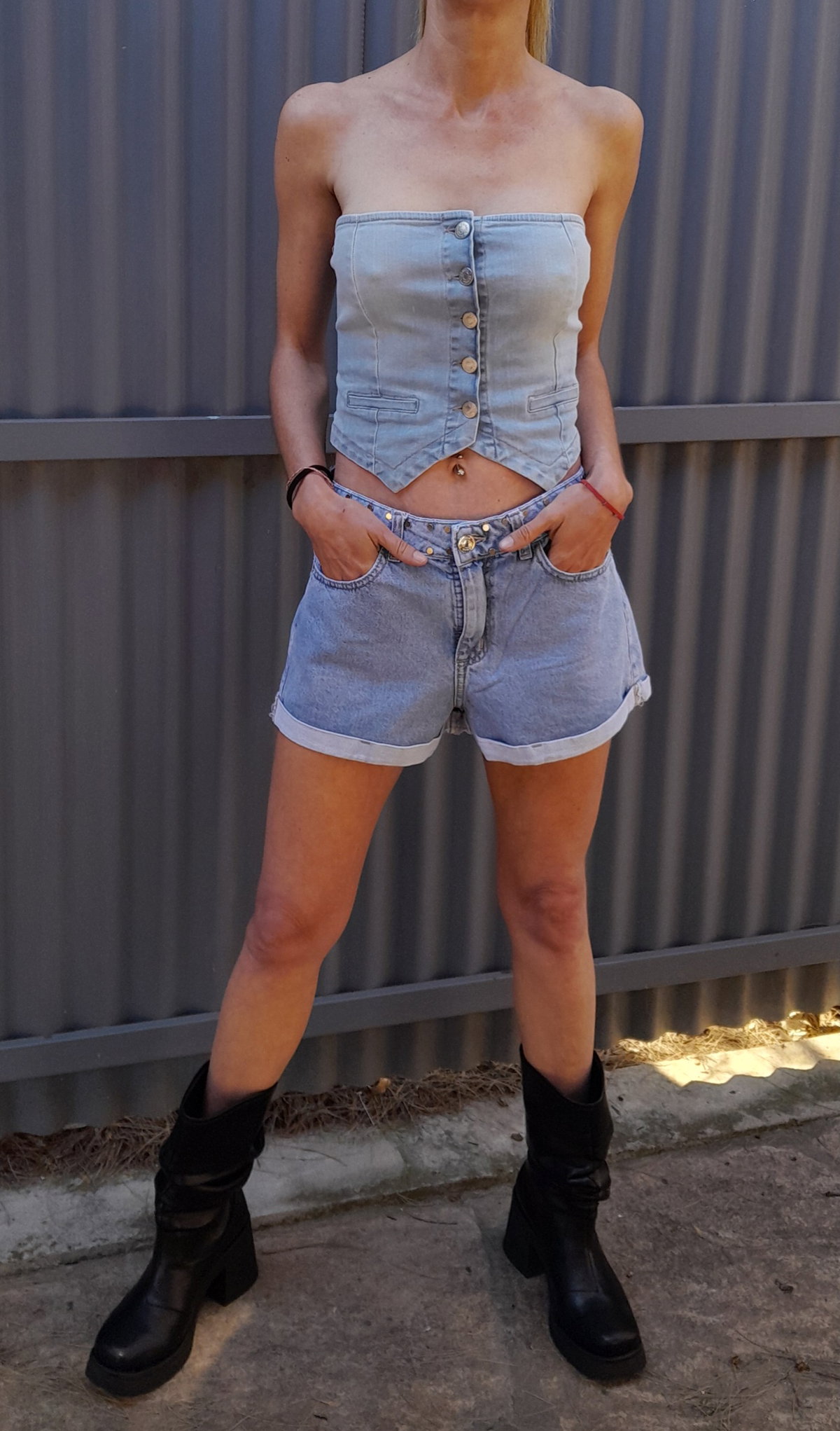 Top estilo corset denim strapless – El jean se reinventa en clave sexy y urbana. Un corset strapless elastizado con botones metálicos y corte en punta que resalta la cintura y deja el abdomen al descubierto.