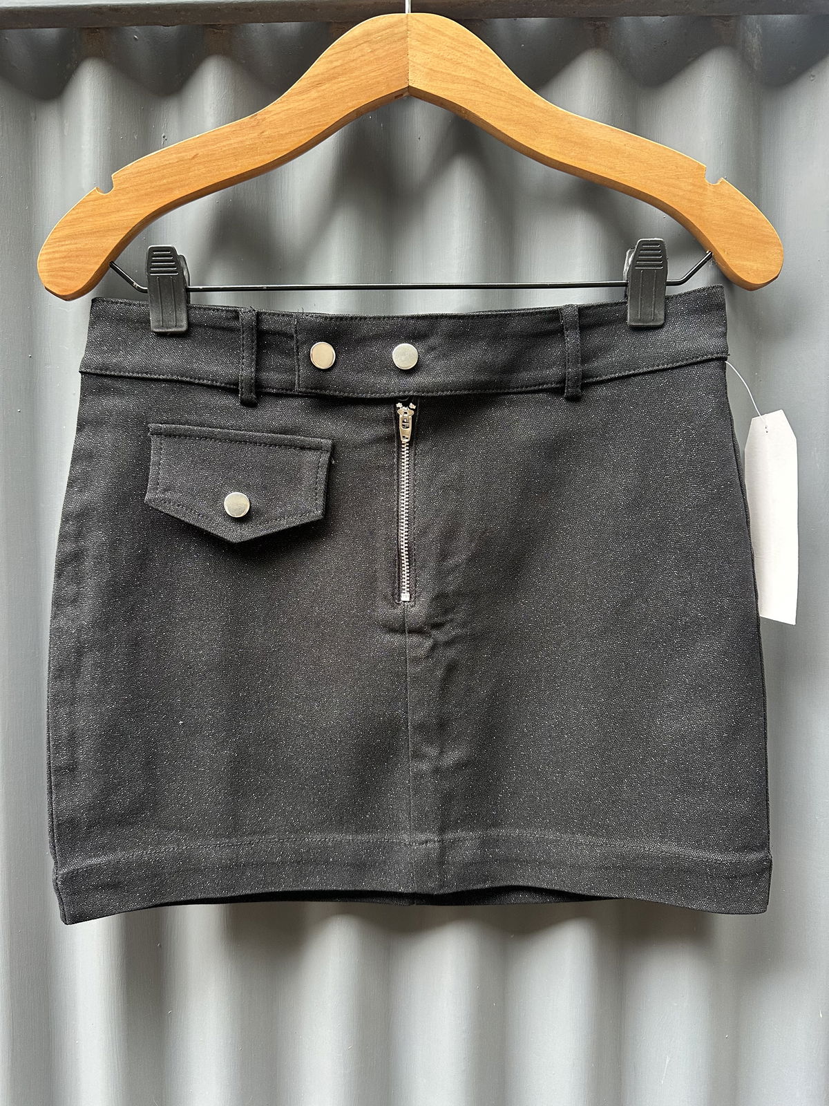 Brillo justo, calce perfecto. Mini de bengalina elastizada con glitter, detalle de cierre frontal y bolsillo con botĂłn. Combinala con el top haciendo juego y brillĂĄ sin esfuerzo đĽ