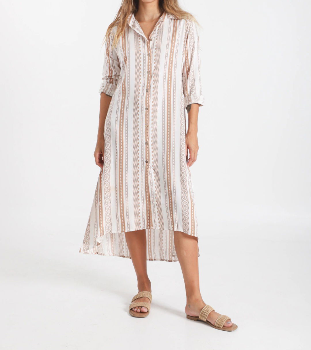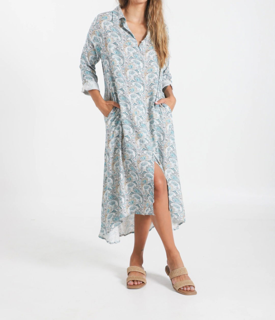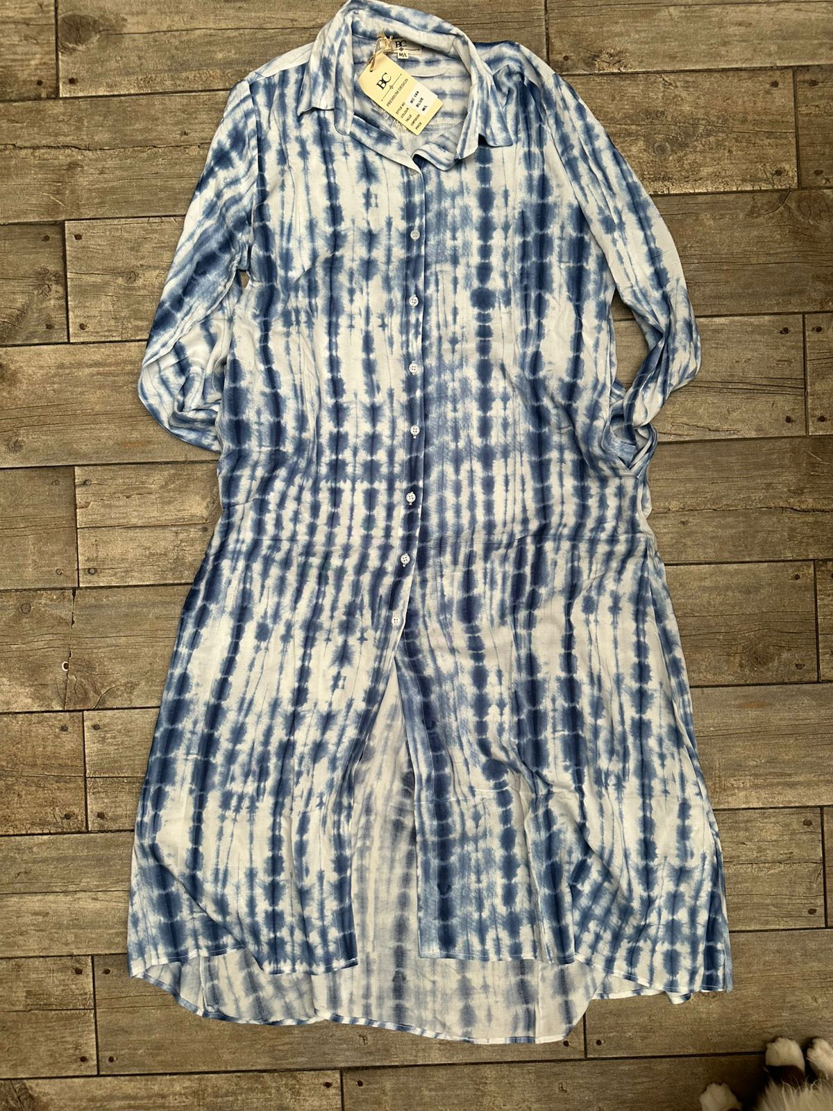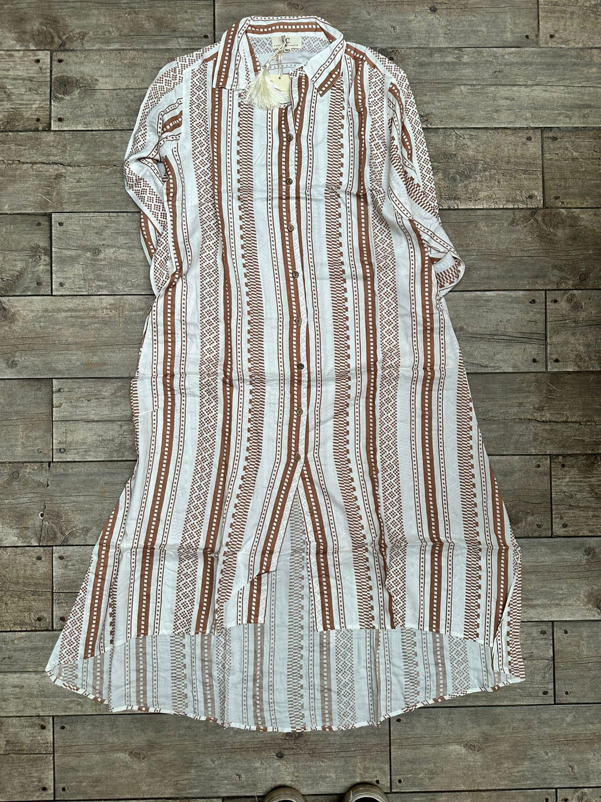 Camisero largo con estampa de India, en fibrana estampada super suave, con movimiento, corte relajado y tajos laterales que le suman actitud. Úsalo suelto o marcá la cintura con un cinturón.