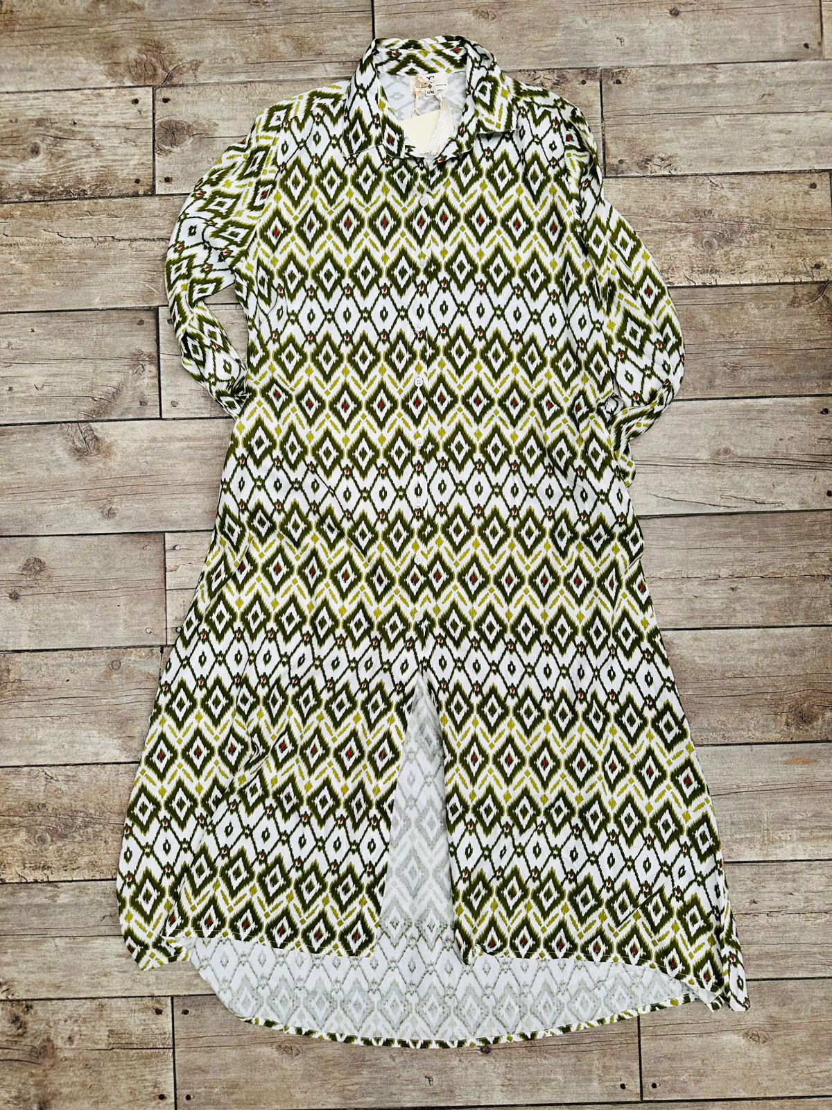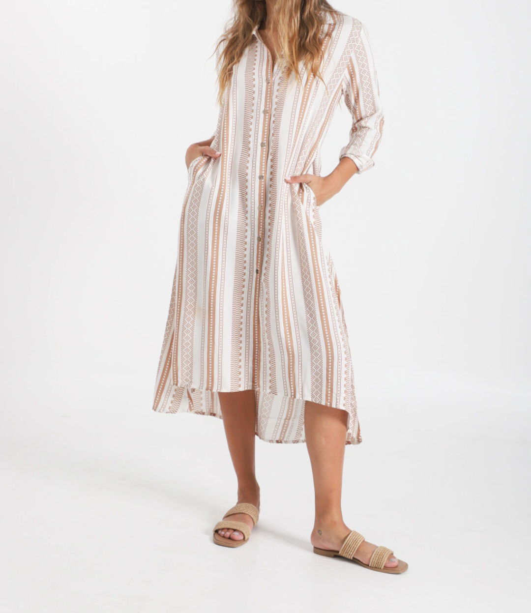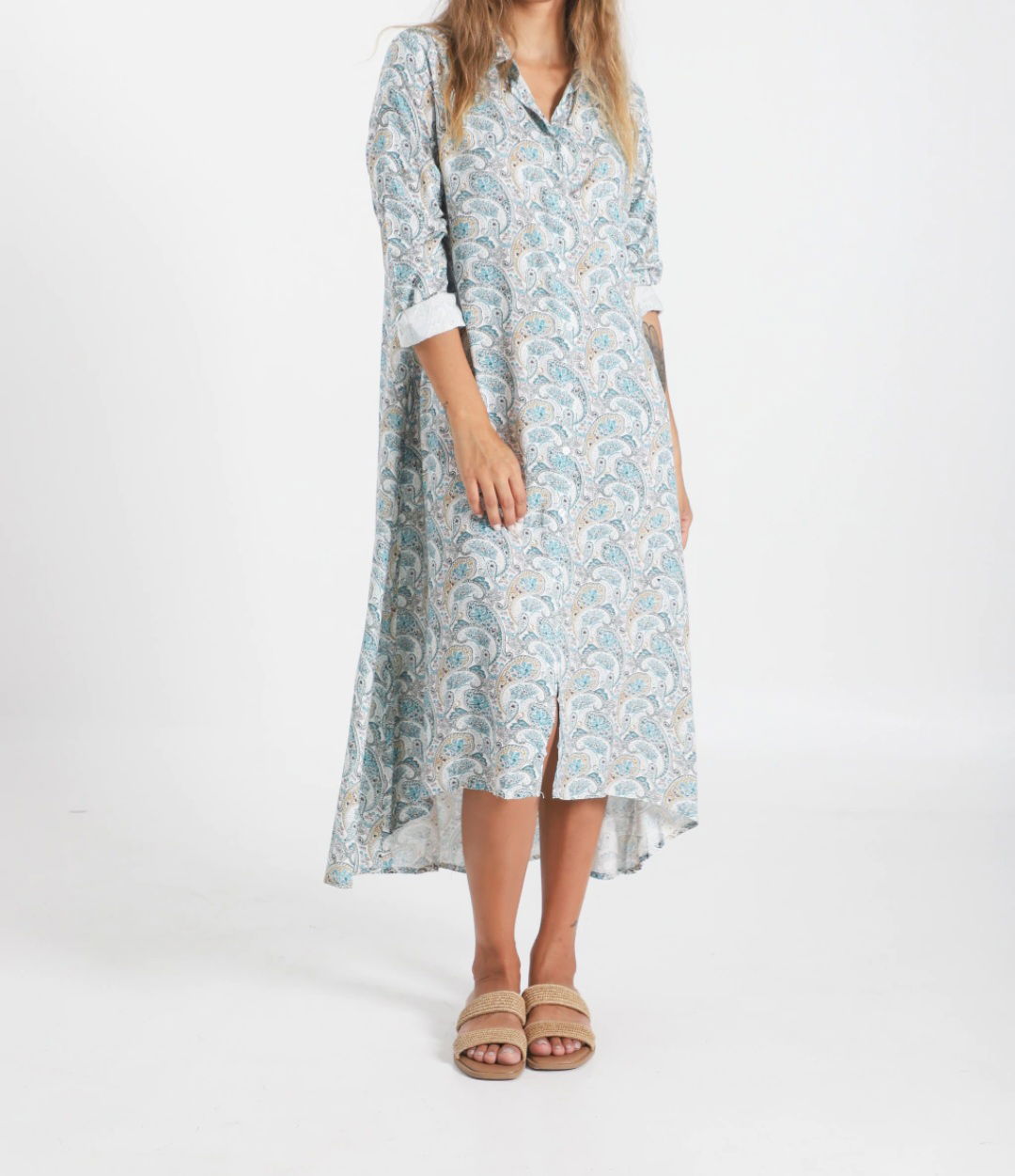 Camisero largo con estampa de India, en fibrana estampada super suave, con movimiento, corte relajado y tajos laterales que le suman actitud. Úsalo suelto o marcá la cintura con un cinturón.