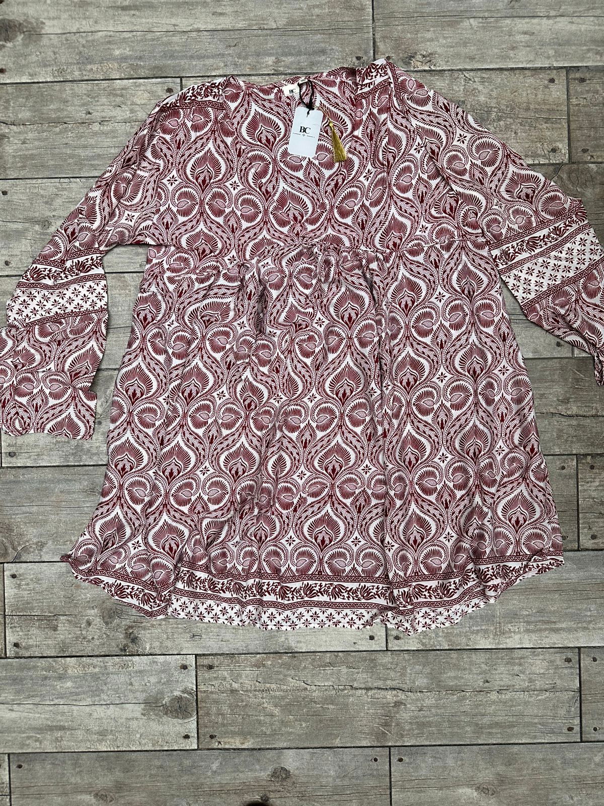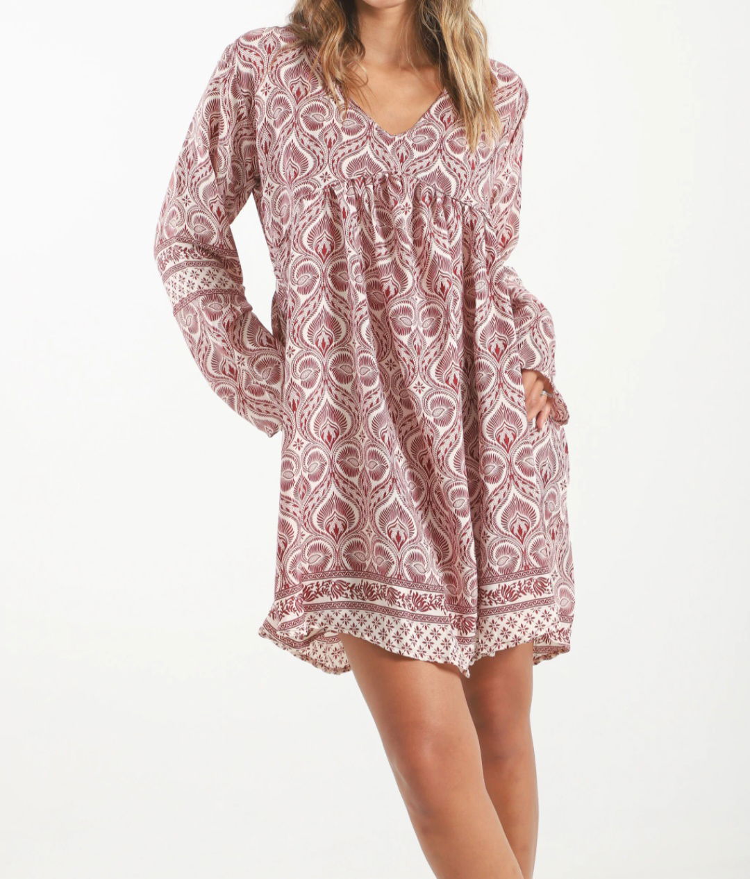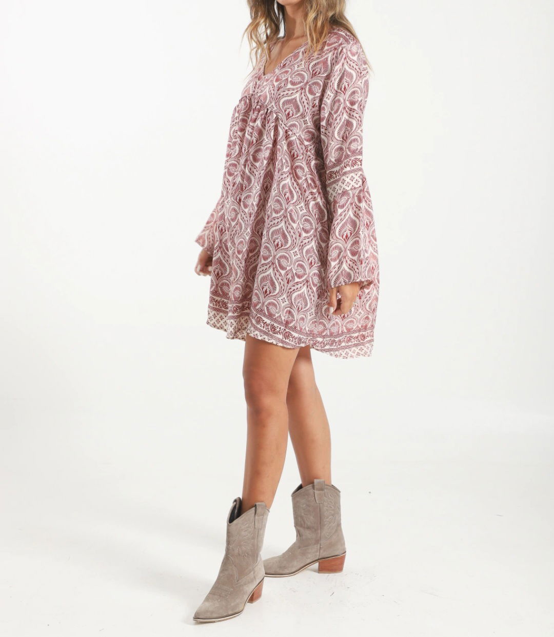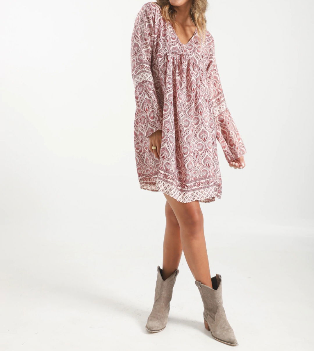 Vestido de seda Gure – Bohemio, fresco y con alma libre. Su corte amplio y el estampado artesanal en tonos vino hacen que fluya con cada movimiento. Una prenda que se luce con botas, sandalias o descalza en la arena.
