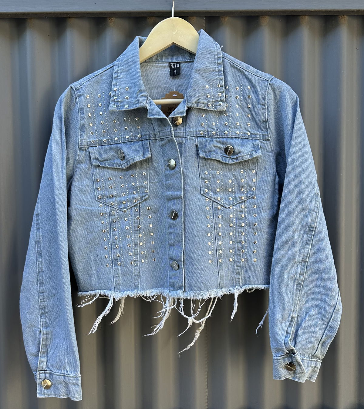 ▪︎ Campera de jean full tachas con terminación desflecada. Ideal para levantar cualquier look.