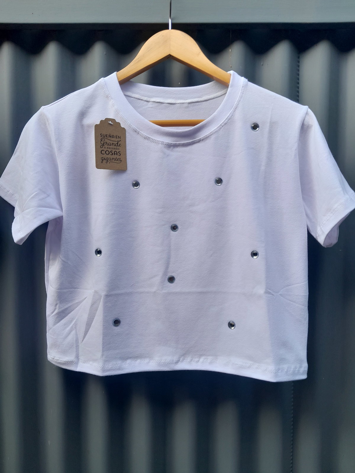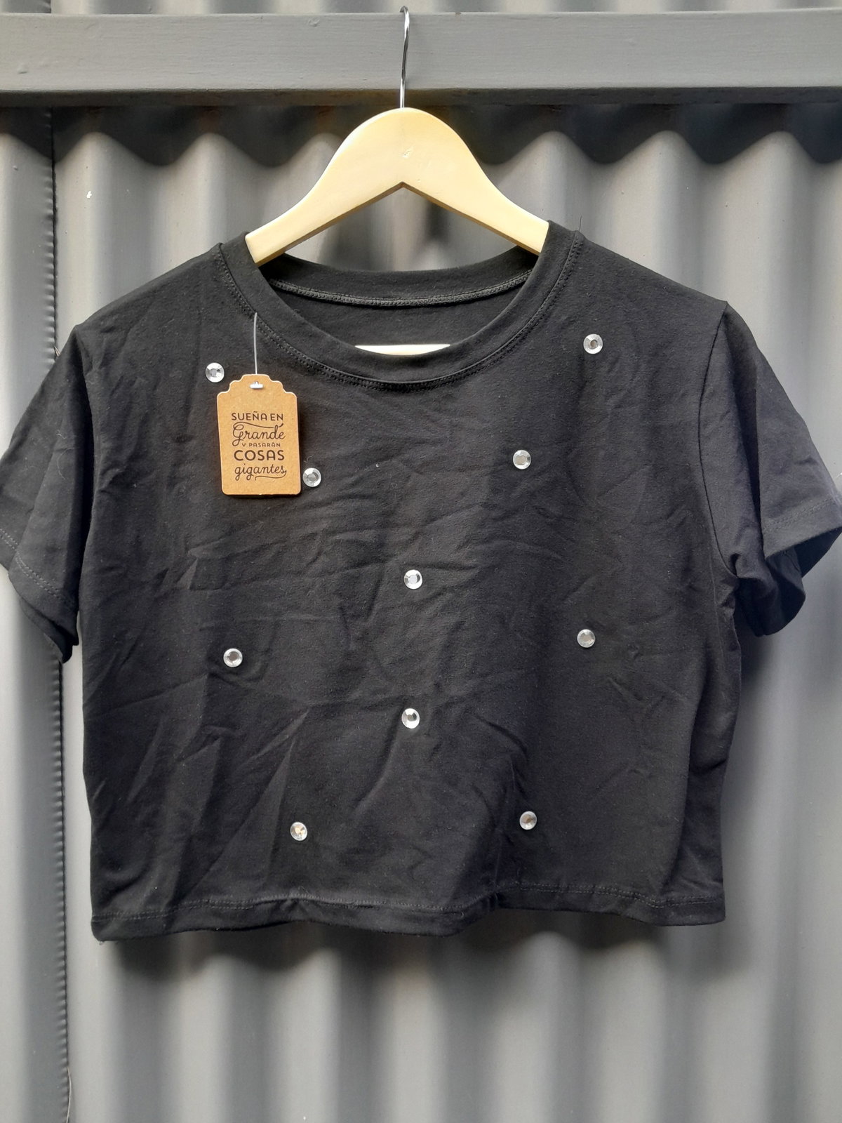 ▪︎ Remera de algodón y lycra, elastizada, con strass.