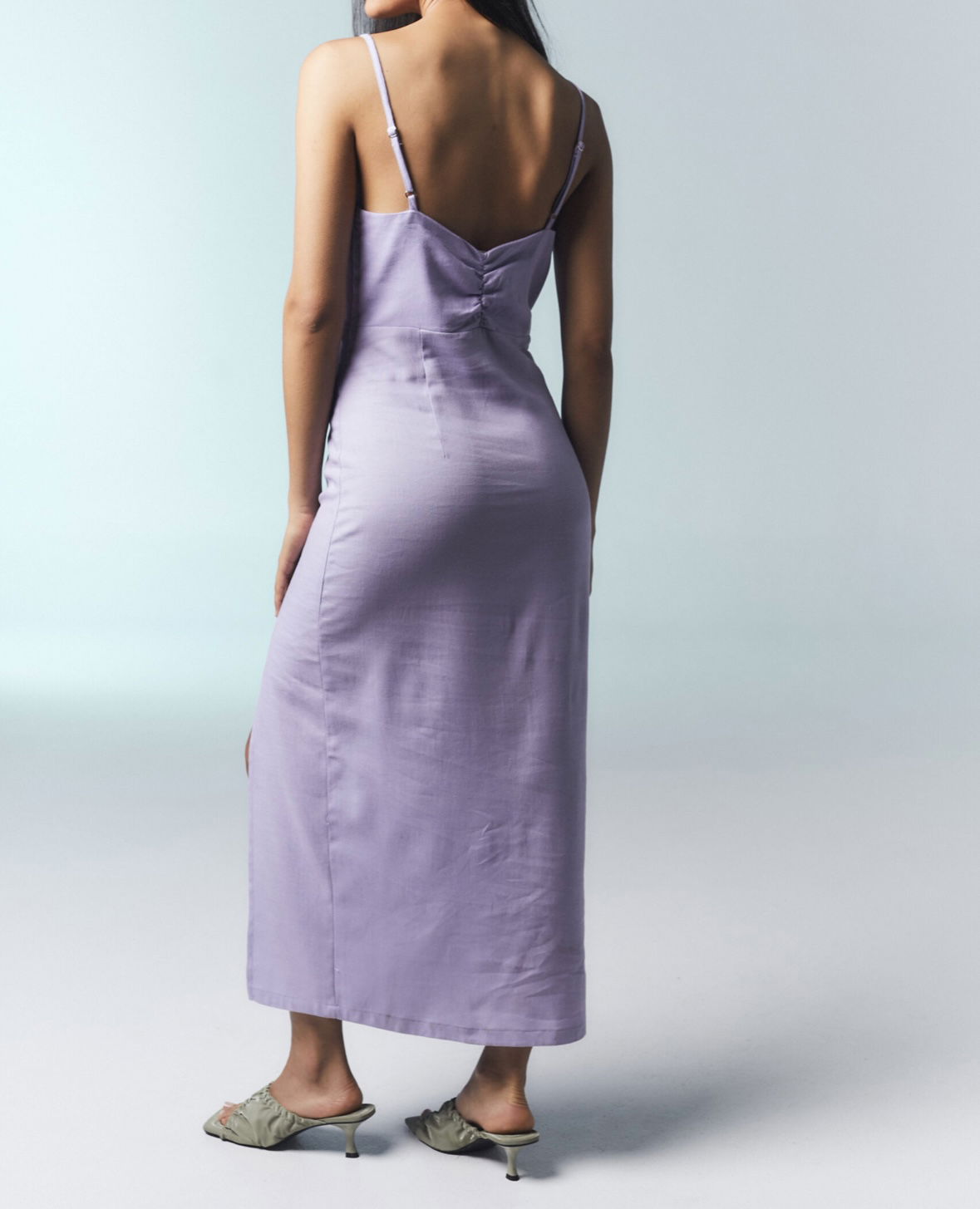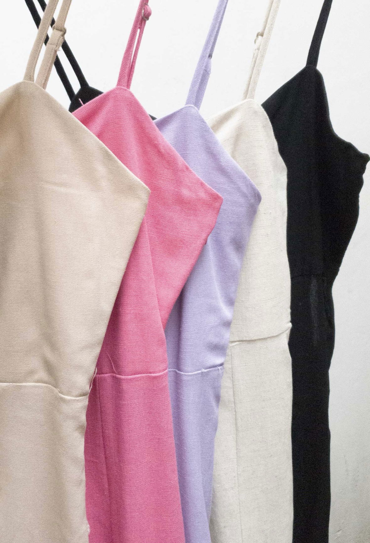 • Vestido de lino con spandex, con frunce en el busto y en la espalda y tajo en la pierna.